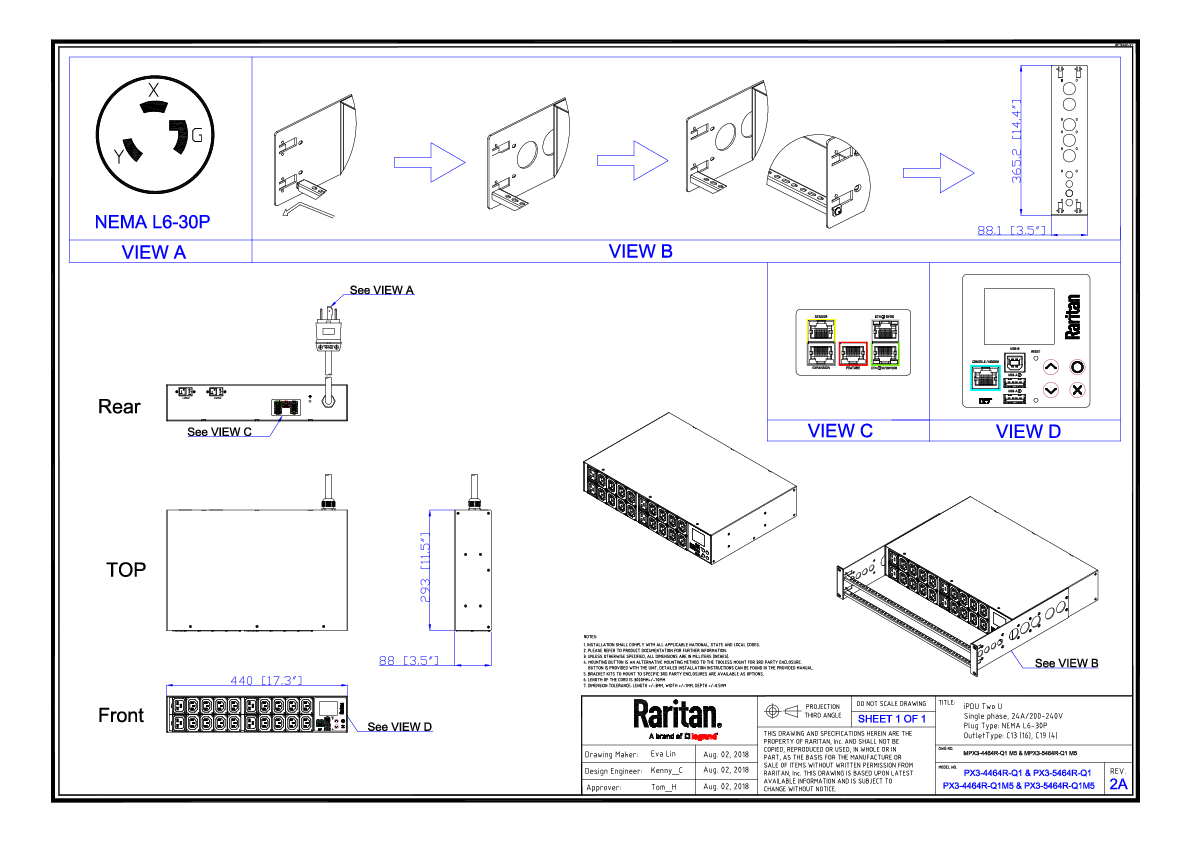 Monitored rack power distribution unit (2U [horizontal], 5kVA, 20 outlets). INPUT: 208v, 30a - NEMA L6-30P plug (2P3W); OUTPUT: 16@ C13, 4@ C19 outlets; on 2@ 2-pole, 20a Overcurrent Protectors; FEATURES: Billing-Grade (+/- 1%) Energy Metering [kW, kVA, V, A, Power Factor] - per inlet, per breaker/fuse, per outlet; Remote network monitoring via HTML, JSON-RPC, SSH, Telnet, MODBUS/TCP, and SNMPv3. Onboard embedded processor with minimum 536MHz clock speed, 16MB SPI Flash, and 64MB DDR2 RAM. Cascading upto 16 PDU's using single Ethernet or USB connection. Environmental monitoring [temp/humidity] capable – up to 32 sensors. Individual outlet numbers labeled on chassis. Automated deployment via TFTP, DHCP, SSH(CLI), or USB Flash Drives. WiFi Capable. USB Webcam Capable. iPad/iPhone/Android App. Dual 10/100/1000 Ethernet port. Tri-color status LED per receptacle. Breaker metering and alarming (0V detection). Max Dimensions 440mm x 293mm x 88mm (17.3in x 11.5in x 3.5in). Max Weight 6.3 kg. Maximum ambient temperature 60C at full load.
