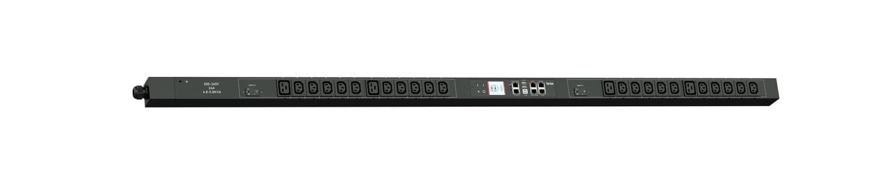 Monitored and switched rack power distribution unit (0U [vertical], 5kVA, 20 outlets). INPUT: 208v, 30a - NEMA L6-30P plug (2P3W); OUTPUT: 16@ C13 Locking, 4@ C19 Locking outlets; on 2@ 2-pole, 20a Overcurrent Protectors; FEATURES: Billing-Grade (+/- 1%) Energy Metering [kW, kVA, V, A, Power Factor] - per inlet, per breaker/fuse, per outlet; Remote network monitoring via HTML, JSON-RPC, SSH, Telnet, MODBUS/TCP, and SNMPv3. Onboard embedded processor with minimum 536MHz clock speed, 16MB SPI Flash, and 64MB DDR2 RAM. Cascading upto 16 PDU's using single Ethernet or USB connection. Environmental monitoring [temp/humidity] capable – up to 32 sensors. Individual outlet numbers labeled on chassis. Automated deployment via TFTP, DHCP, SSH(CLI), or USB Flash Drives. WiFi Capable. USB Webcam Capable. iPad/iPhone/Android App. Dual 10/100/1000 Ethernet port. Tri-color status LED per receptacle. Breaker metering and alarming (0V detection). Max Dimensions 52mm x 71mm x 1539mm (2.1in x 2.8in x 60.6in). Max Weight 5.6 kg. Maximum ambient temperature 60C at full load.
