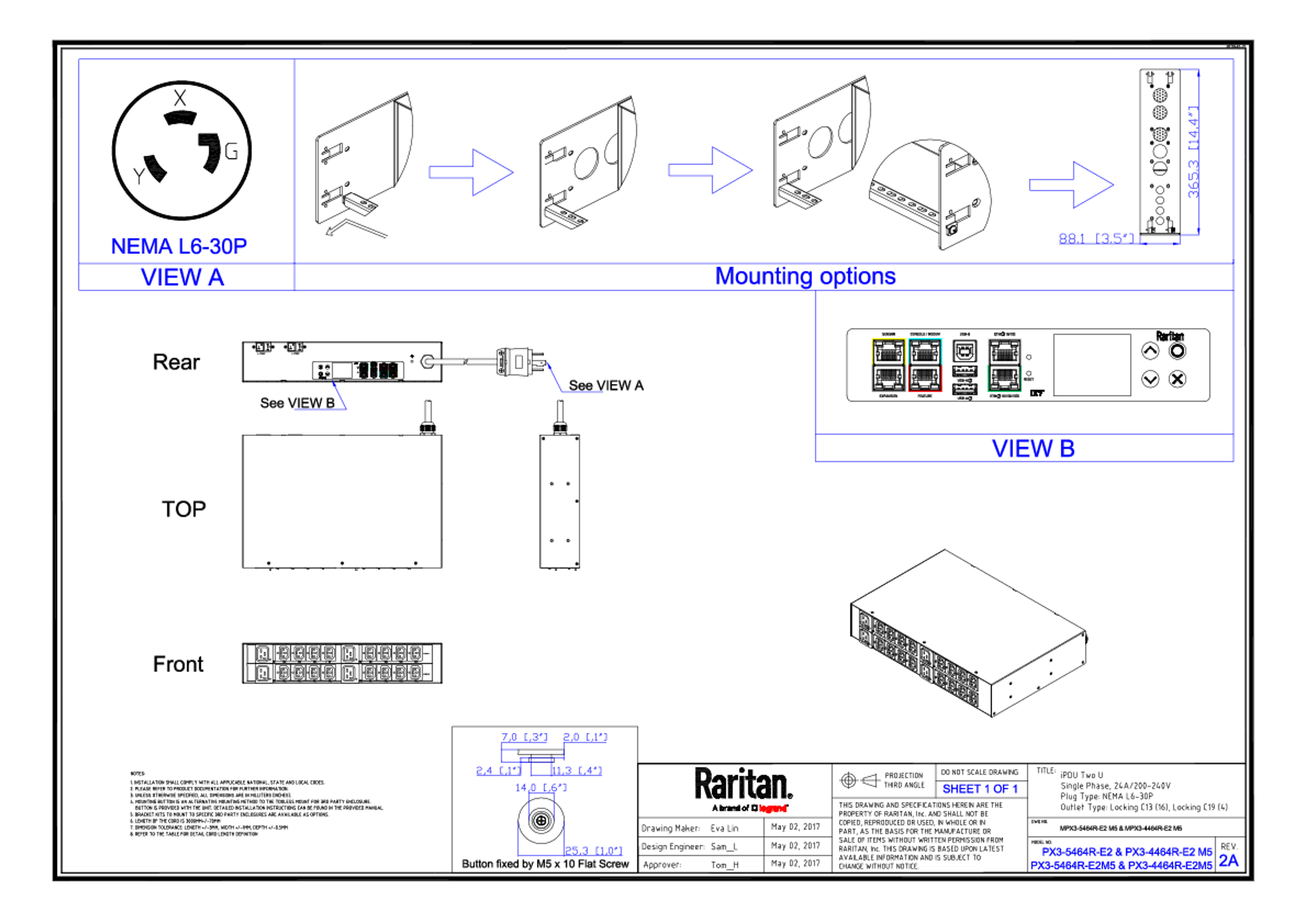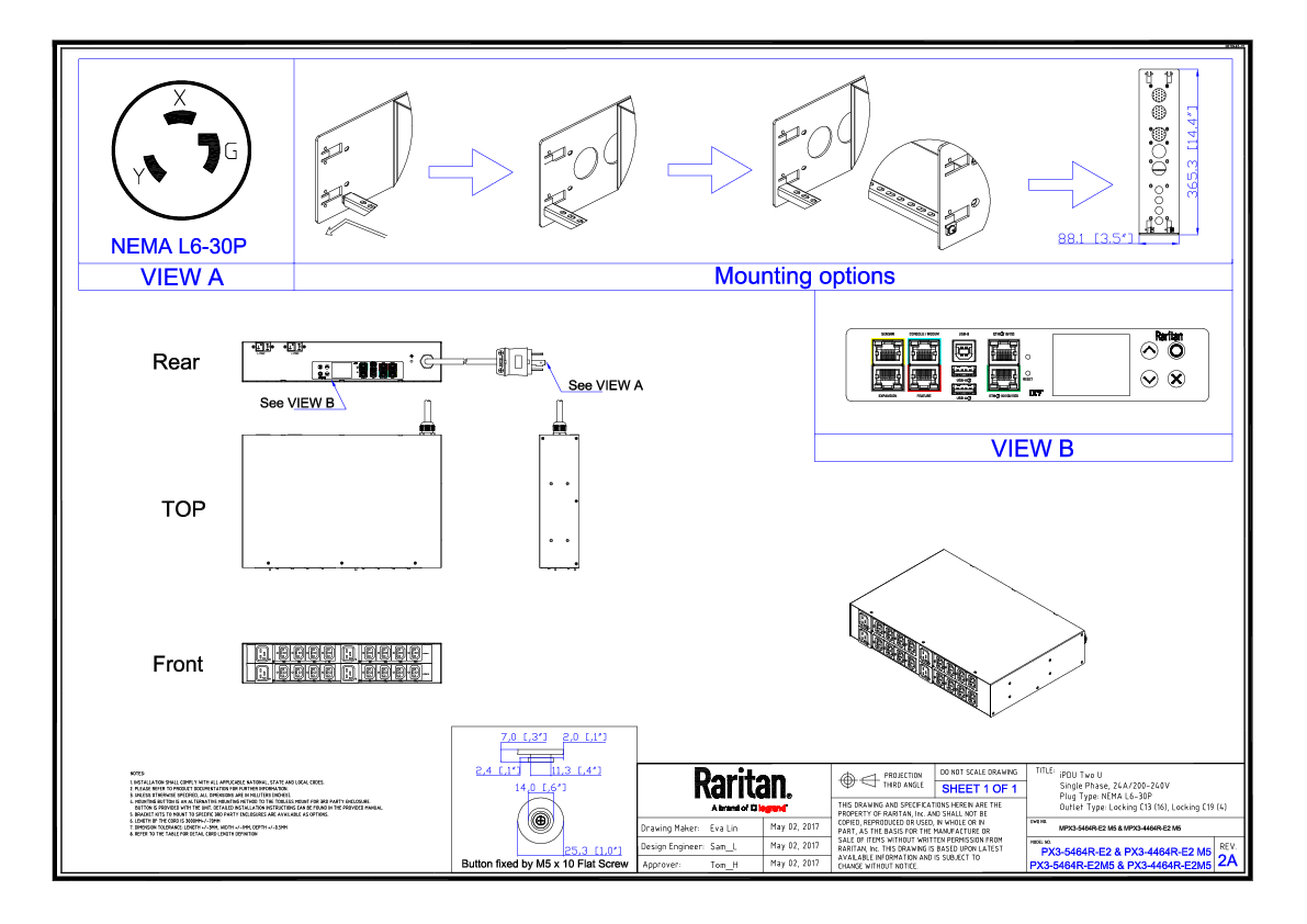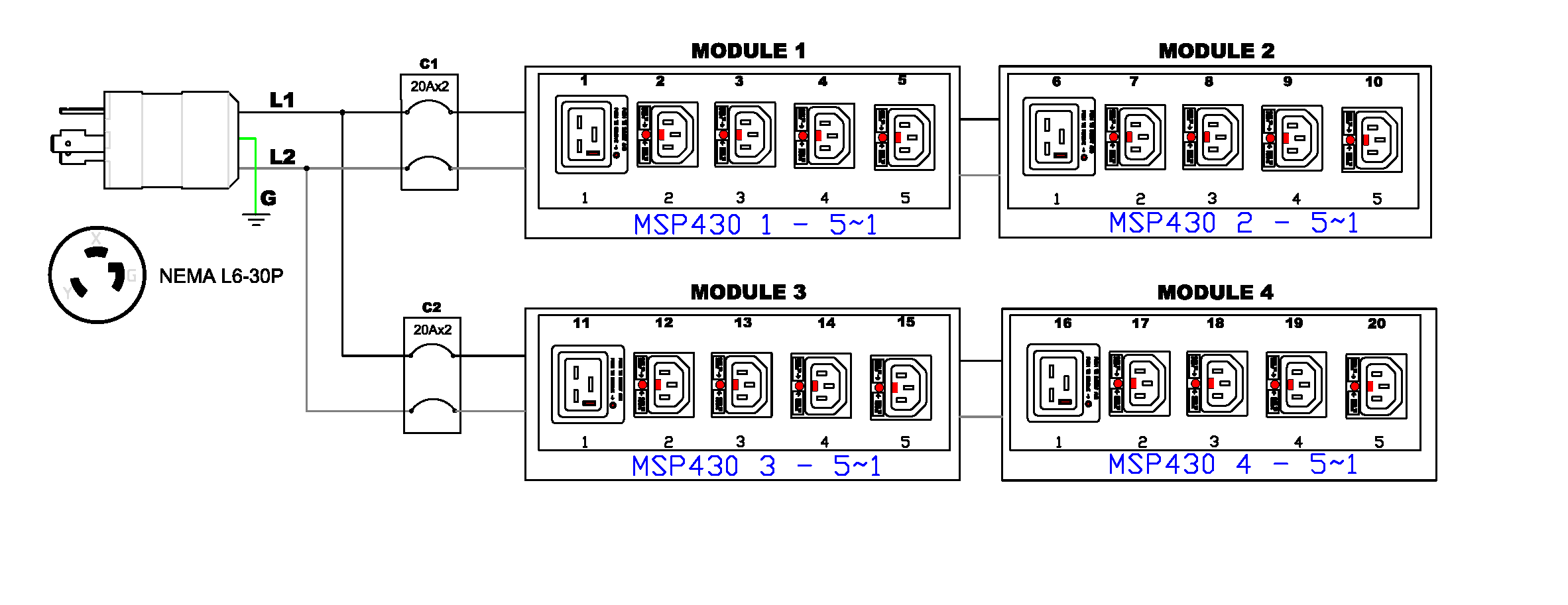 1PH, 208V AC, 30A (24A rated); 20 outlets: 16x C13 Locking, 4x C19 Locking; plug: NEMA L6-30P (Rear feed), 5.0kVA; Outlet Metered/Switched, 2U horizontal PDU
