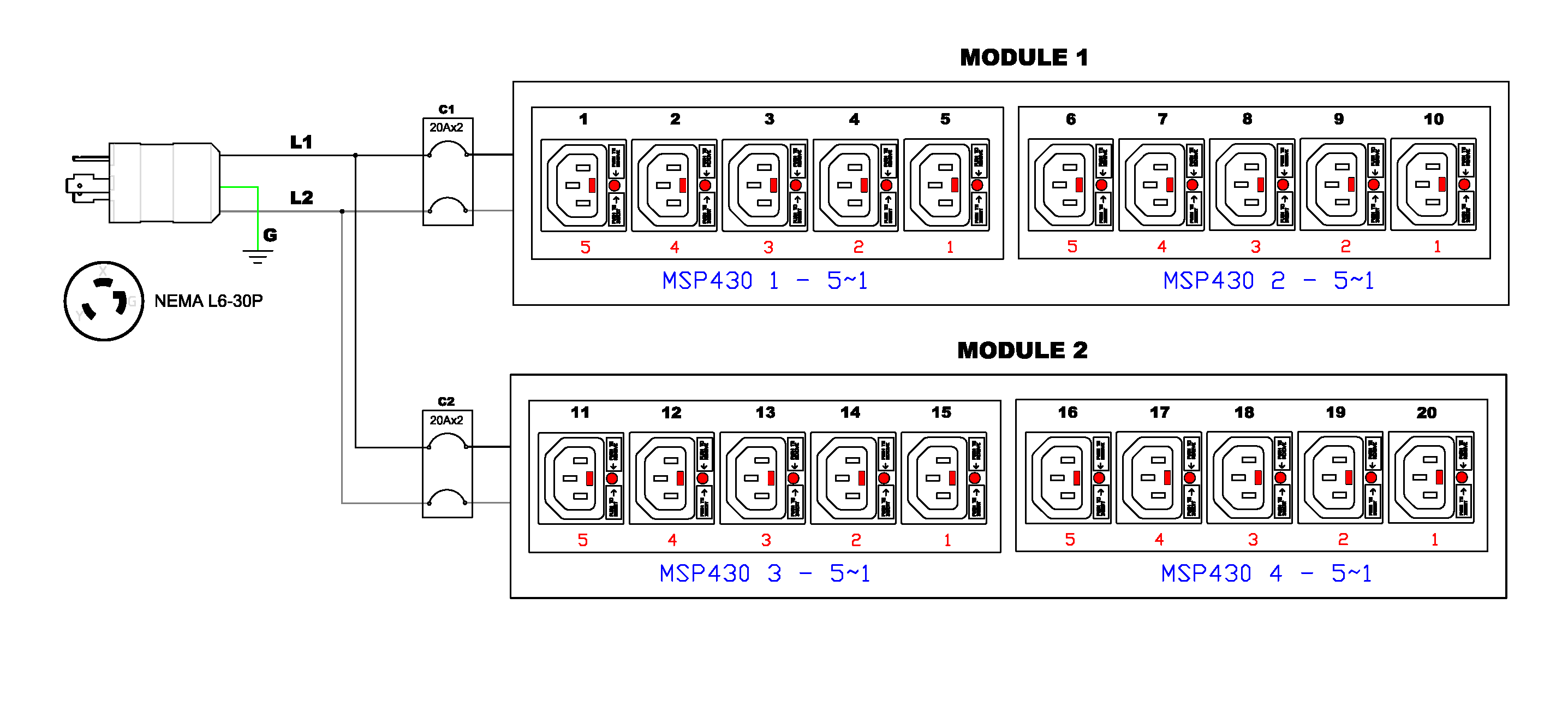 1PH, 208V AC, 30A (24A rated); 20 outlets: 20x C13 Locking; plug: NEMA L6-30P (Rear feed), 5.0kVA; Outlet Metered, 2U horizontal PDU