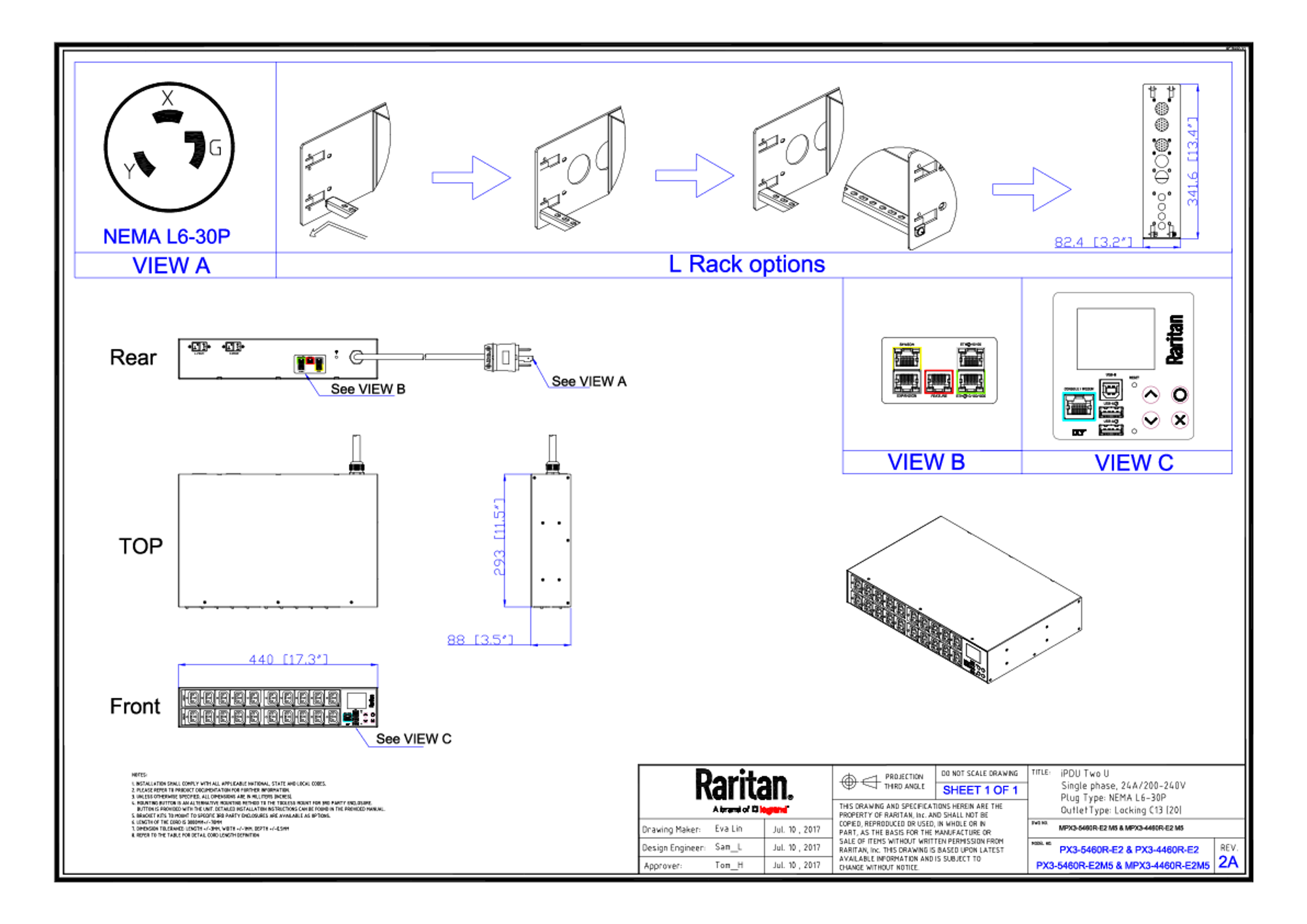1PH, 208V AC, 30A (24A rated); 20 outlets: 20x C13 Locking; plug: NEMA L6-30P (Rear feed), 5.0kVA; Outlet Metered/Switched, 2U horizontal PDU