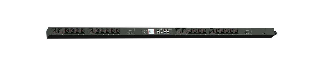 Monitored and switched rack power distribution unit (0U [vertical], 5kVA, 24 outlets). INPUT: 208v, 30a - NEMA L6-30P plug (2P3W); OUTPUT: 18@ C13 Locking, 6@ C19 Locking outlets; on 2@ 2-pole, 20a Overcurrent Protectors; FEATURES: Billing-Grade (+/- 1%) Energy Metering [kW, kVA, V, A, Power Factor] - per inlet, per breaker/fuse, per outlet; Remote network monitoring via HTML, JSON-RPC, SSH, Telnet, MODBUS/TCP, and SNMPv3. Onboard embedded processor with minimum 536MHz clock speed, 16MB SPI Flash, and 64MB DDR2 RAM. Cascading upto 16 PDU's using single Ethernet or USB connection. Environmental monitoring [temp/humidity] capable – up to 32 sensors. Individual outlet numbers labeled on chassis. Automated deployment via TFTP, DHCP, SSH(CLI), or USB Flash Drives. WiFi Capable. USB Webcam Capable. iPad/iPhone/Android App. Dual 10/100/1000 Ethernet port. Tri-color status LED per receptacle. Breaker metering and alarming (0V detection). Max Dimensions 52mm x 71mm x 1539mm (2.1in x 2.8in x 60.6in). Max Weight 6 kg. Maximum ambient temperature 60C at full load.