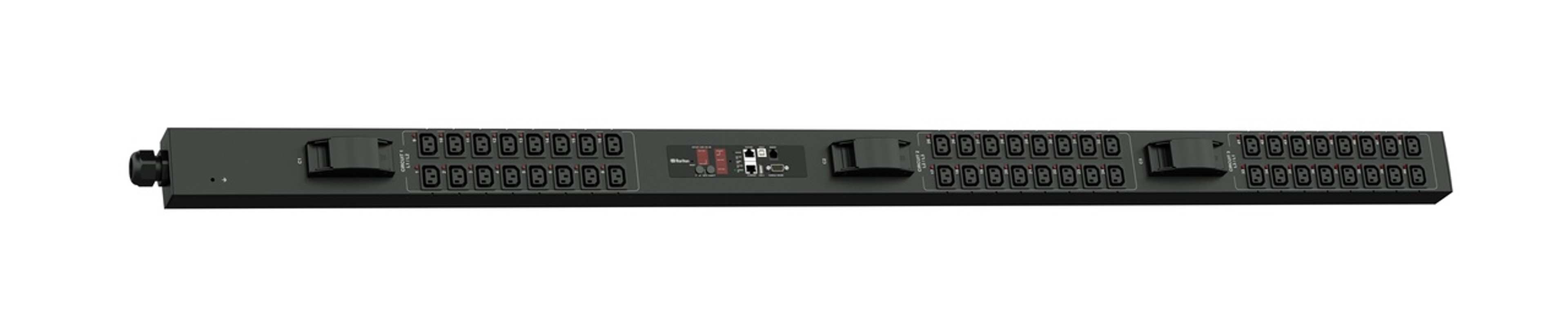 Monitored and switched rack power distribution unit (0U [vertical], 5kVA, 24 outlets). INPUT: 208v, 30a - NEMA L6-30P plug (2P3W); OUTPUT: 20@ C13, 4@ C19 outlets; on 2@ 2-pole, 20a Overcurrent Protectors; FEATURES: Billing-Grade (+/- 1%) Energy Metering [kW, kVA, V, A, Power Factor] - per inlet, per breaker/fuse, per outlet; Remote network monitoring via HTML, JSON-RPC, SSH, Telnet, MODBUS/TCP, and SNMPv3. Onboard embedded processor with minimum 536MHz clock speed, 16MB SPI Flash, and 64MB DDR2 RAM. Cascading upto 16 PDU's using single Ethernet or USB connection. Environmental monitoring [temp/humidity] capable – up to 32 sensors. Individual outlet numbers labeled on chassis. Automated deployment via TFTP, DHCP, SSH(CLI), or USB Flash Drives. WiFi Capable. USB Webcam Capable. iPad/iPhone/Android App. Dual 10/100/1000 Ethernet port. Tri-color status LED per receptacle. Breaker metering and alarming (0V detection). Max Dimensions 52mm x 65mm x 1539mm (2.1in x 2.6in x 60.6in). Max Weight 5.2 kg. Maximum ambient temperature 60C at full load.