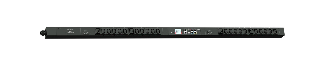 Monitored rack power distribution unit (0U [vertical], 5kVA, 24 outlets). INPUT: 208v, 30a - NEMA L6-30P plug (2P3W); OUTPUT: 20@ C13, 4@ C19 outlets; on 2@ 2-pole, 20a Overcurrent Protectors; FEATURES: Billing-Grade (+/- 1%) Energy Metering [kW, kVA, V, A, Power Factor] - per inlet, per breaker/fuse, per outlet; Remote network monitoring via HTML, JSON-RPC, SSH, Telnet, MODBUS/TCP, and SNMPv3. Onboard embedded processor with minimum 536MHz clock speed, 16MB SPI Flash, and 64MB DDR2 RAM. Cascading upto 16 PDU's using single Ethernet or USB connection. Environmental monitoring [temp/humidity] capable – up to 32 sensors. Individual outlet numbers labeled on chassis. Automated deployment via TFTP, DHCP, SSH(CLI), or USB Flash Drives. WiFi Capable. USB Webcam Capable. iPad/iPhone/Android App. Dual 10/100/1000 Ethernet port. Tri-color status LED per receptacle. Breaker metering and alarming (0V detection). Max Dimensions 52mm x 65mm x 1539mm (2.1in x 2.6in x 60.6in). Max Weight TBD. Maximum ambient temperature 60C at full load.