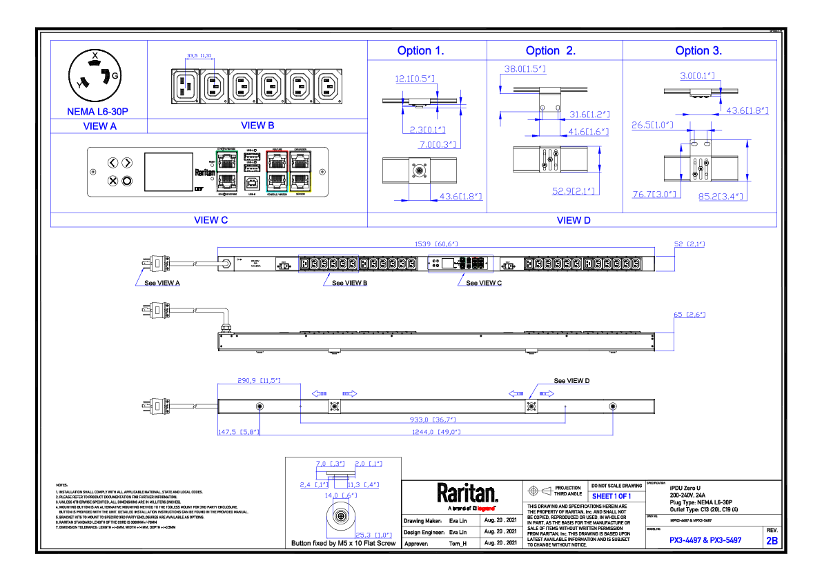 1PH, 208V AC, 30A (24A rated); 24 outlets: 20x C13, 4x C19; plug: NEMA L6-30P (Bottom-front feed), 5.0kVA; Outlet Metered, Zero U vertical PDU