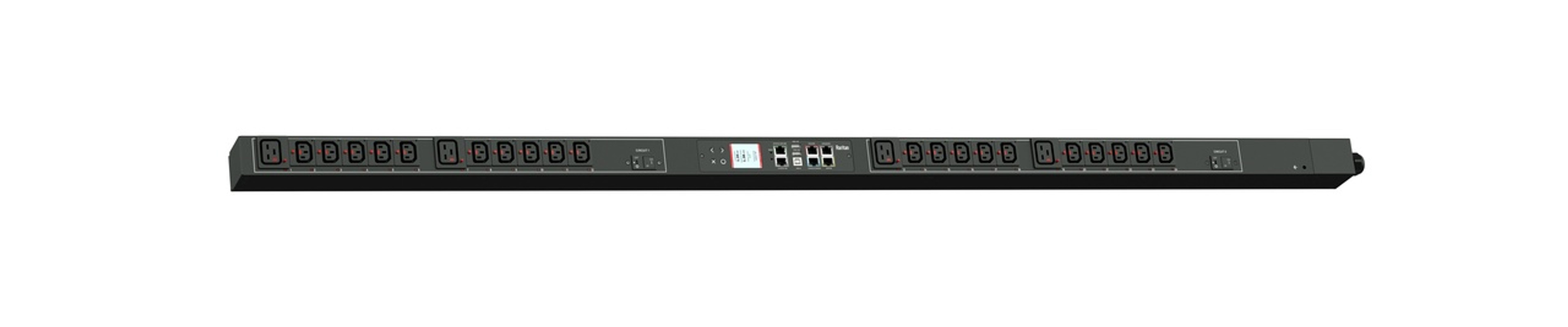 Monitored rack power distribution unit (0U [vertical], 5kVA, 24 outlets). INPUT: 208v, 30a - NEMA L6-30P plug (2P3W); OUTPUT: 20@ C13 Locking, 4@ C19 Locking outlets; on 2@ 2-pole, 20a Overcurrent Protectors; FEATURES: Billing-Grade (+/- 1%) Energy Metering [kW, kVA, V, A, Power Factor] - per inlet, per breaker/fuse, per outlet; Remote network monitoring via HTML, JSON-RPC, SSH, Telnet, MODBUS/TCP, and SNMPv3. Onboard embedded processor with minimum 536MHz clock speed, 16MB SPI Flash, and 64MB DDR2 RAM. Cascading upto 16 PDU's using single Ethernet or USB connection. Environmental monitoring [temp/humidity] capable – up to 32 sensors. Individual outlet numbers labeled on chassis. Automated deployment via TFTP, DHCP, SSH(CLI), or USB Flash Drives. WiFi Capable. USB Webcam Capable. iPad/iPhone/Android App. Dual 10/100/1000 Ethernet port. Tri-color status LED per receptacle. Breaker metering and alarming (0V detection). Max Dimensions 52mm x 71mm x 1539mm (2.1in x 2.8in x 60.6in). Max Weight 5.9 kg. Maximum ambient temperature 60C at full load.