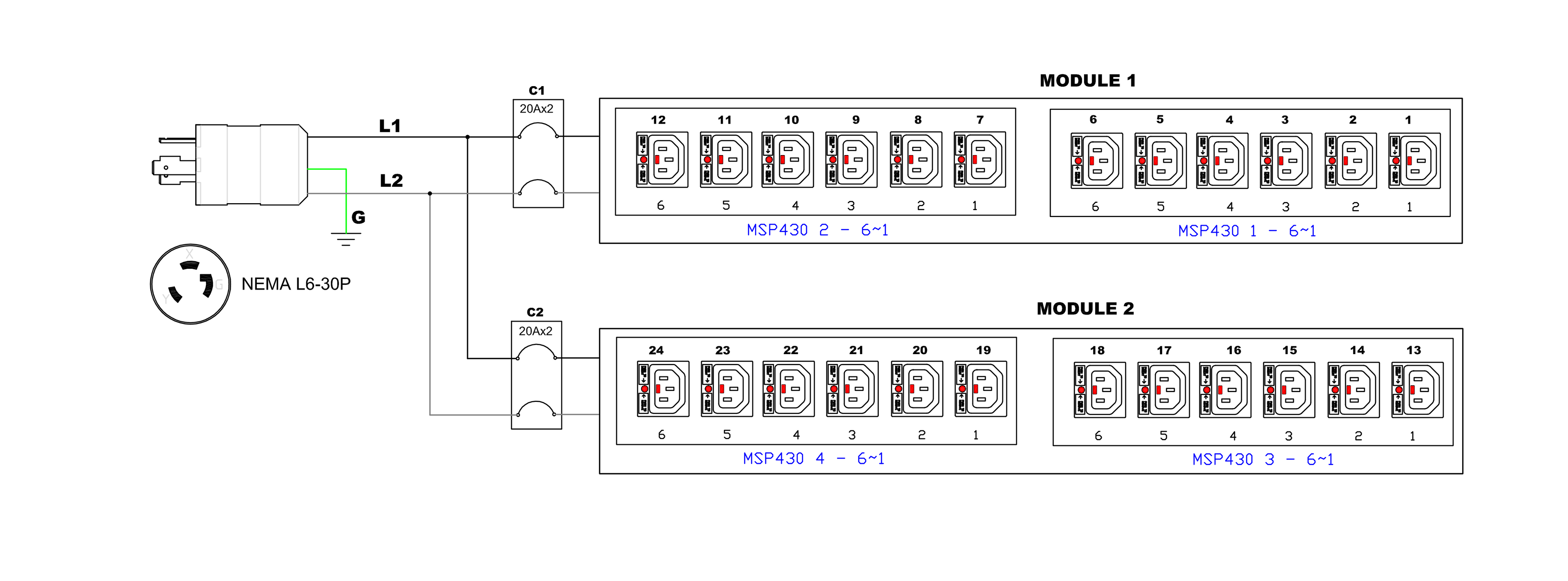 1PH, 208V AC, 30A (24A rated); 24 outlets: 24x C13 Locking; plug: NEMA L6-30P (Top-top feed), 5.0kVA; Outlet Metered, Zero U vertical PDU