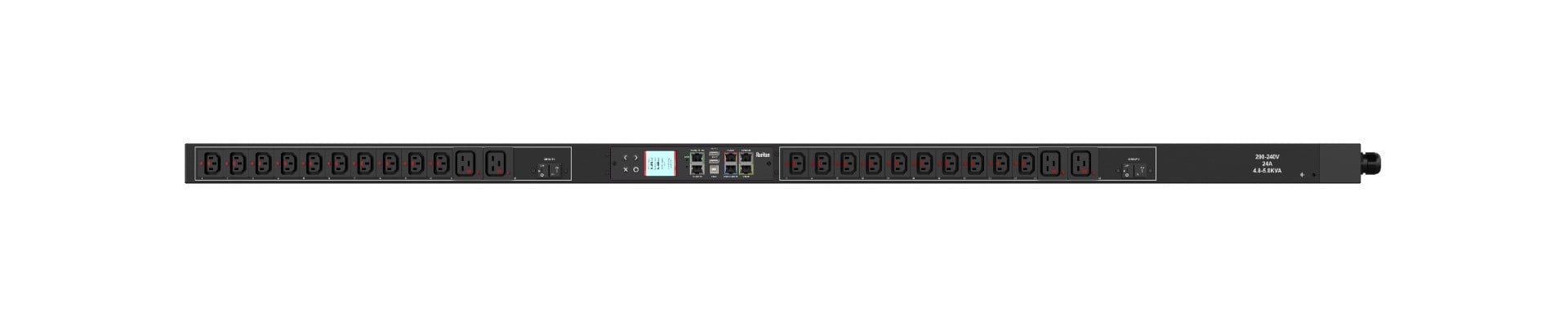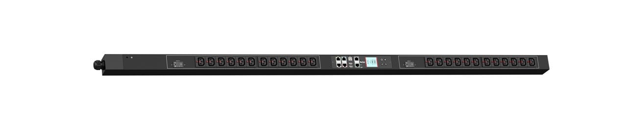 Monitored rack power distribution unit (0U [vertical], 5kVA, 24 outlets). INPUT: 208v, 30a - NEMA L6-30P plug (2P3W); OUTPUT: 24@ C13 Locking outlets; on 2@ 2-pole, 20a Overcurrent Protectors; FEATURES: Billing-Grade (+/- 1%) Energy Metering [kW, kVA, V, A, Power Factor] - per inlet, per breaker/fuse, per outlet; Remote network monitoring via HTML, JSON-RPC, SSH, Telnet, MODBUS/TCP, and SNMPv3. Onboard embedded processor with minimum 536MHz clock speed, 16MB SPI Flash, and 64MB DDR2 RAM. Cascading upto 16 PDU's using single Ethernet or USB connection. Environmental monitoring [temp/humidity] capable – up to 32 sensors. Individual outlet numbers labeled on chassis. Automated deployment via TFTP, DHCP, SSH(CLI), or USB Flash Drives. WiFi Capable. USB Webcam Capable. iPad/iPhone/Android App. Dual 10/100/1000 Ethernet port. Tri-color status LED per receptacle. Breaker metering and alarming (0V detection). Max Dimensions 52mm x 65mm x 1539mm (2.1in x 2.6in x 60.6in). Max Weight 5.2 kg. Maximum ambient temperature 60C at full load.
