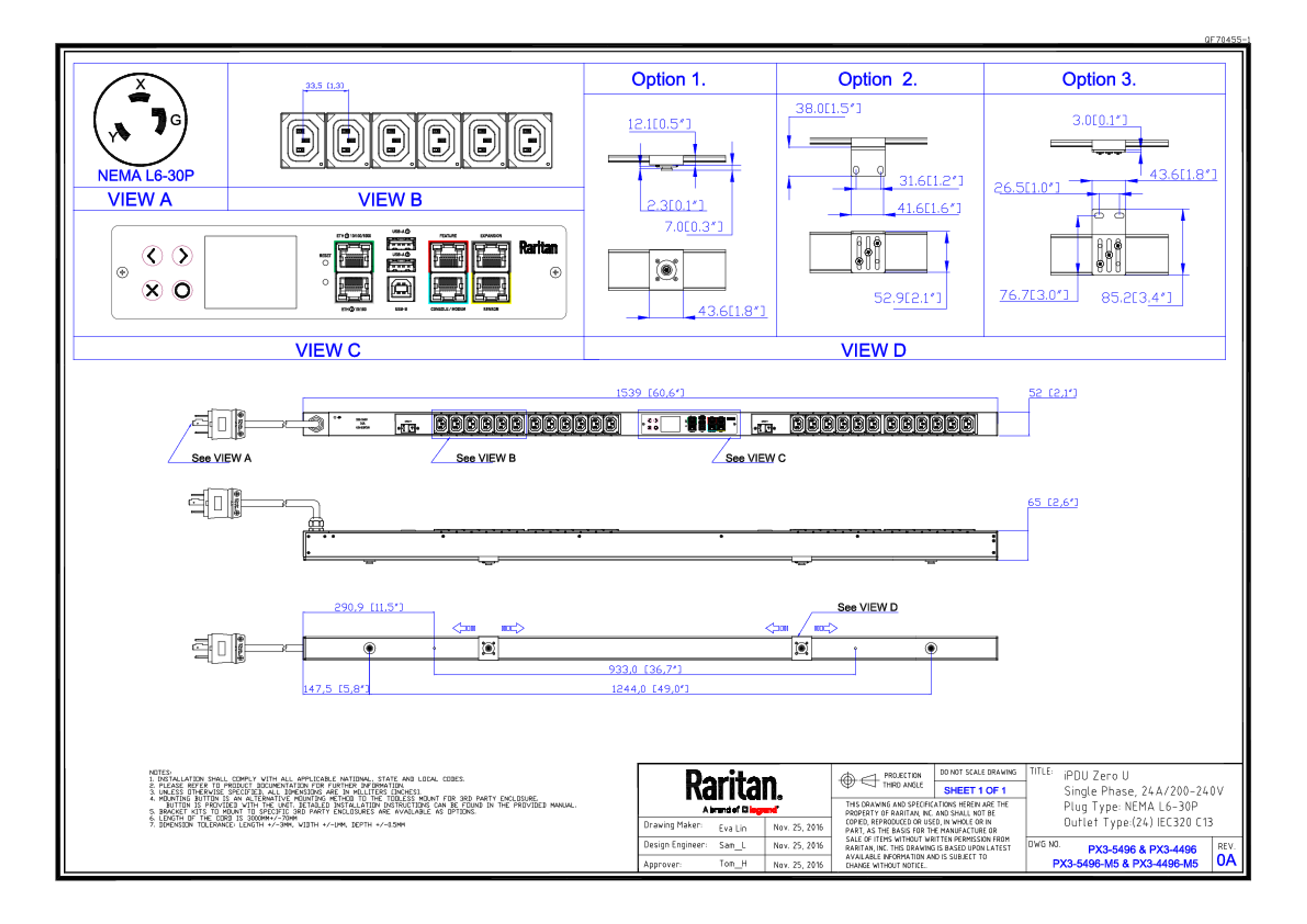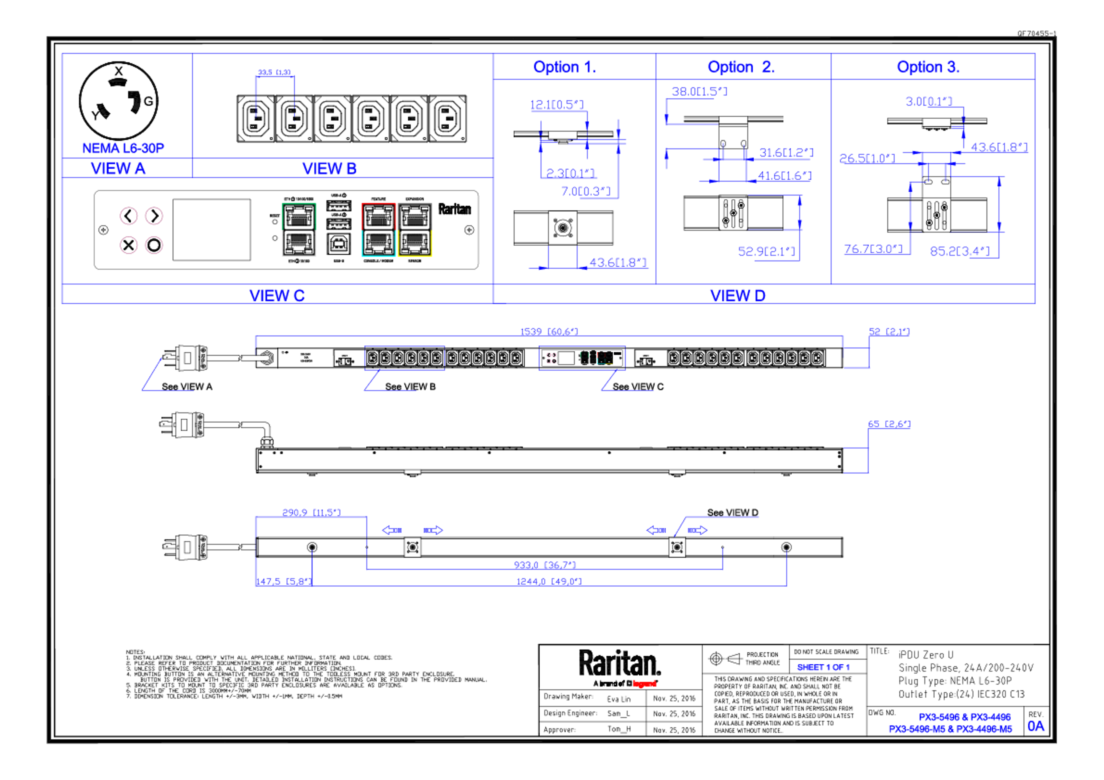 1PH, 208V AC, 30A (24A rated); 24 outlets: 24x C13; plug: NEMA L6-30P (Bottom-front feed), 5.0kVA; Outlet Metered/Switched, Zero U vertical PDU