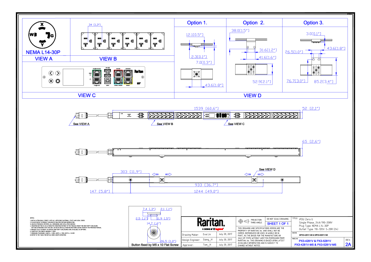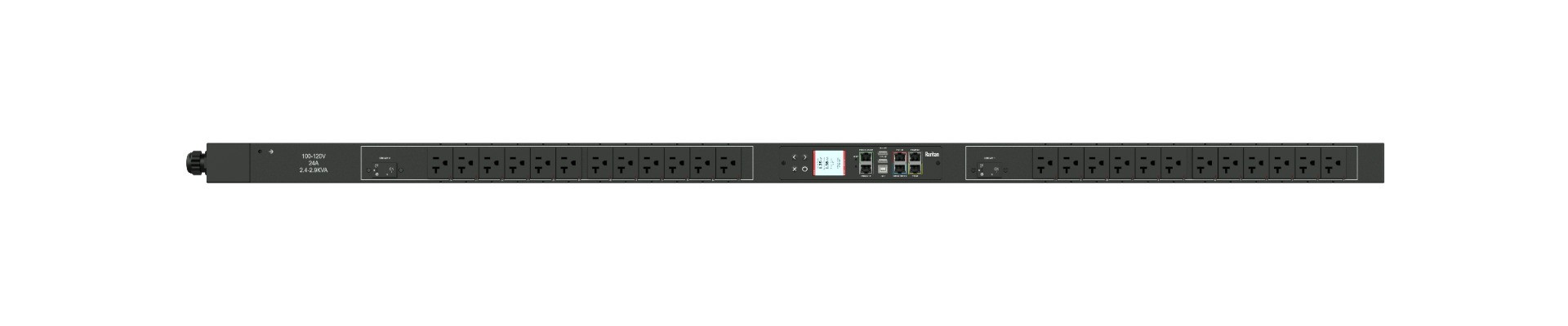 1PH, 208V AC, 30A (24A rated); 24 outlets: 24x NEMA 5-20R; plug: NEMA L14-30P (Bottom-bottom feed), 5.0kVA; Outlet Metered, Zero U vertical PDU