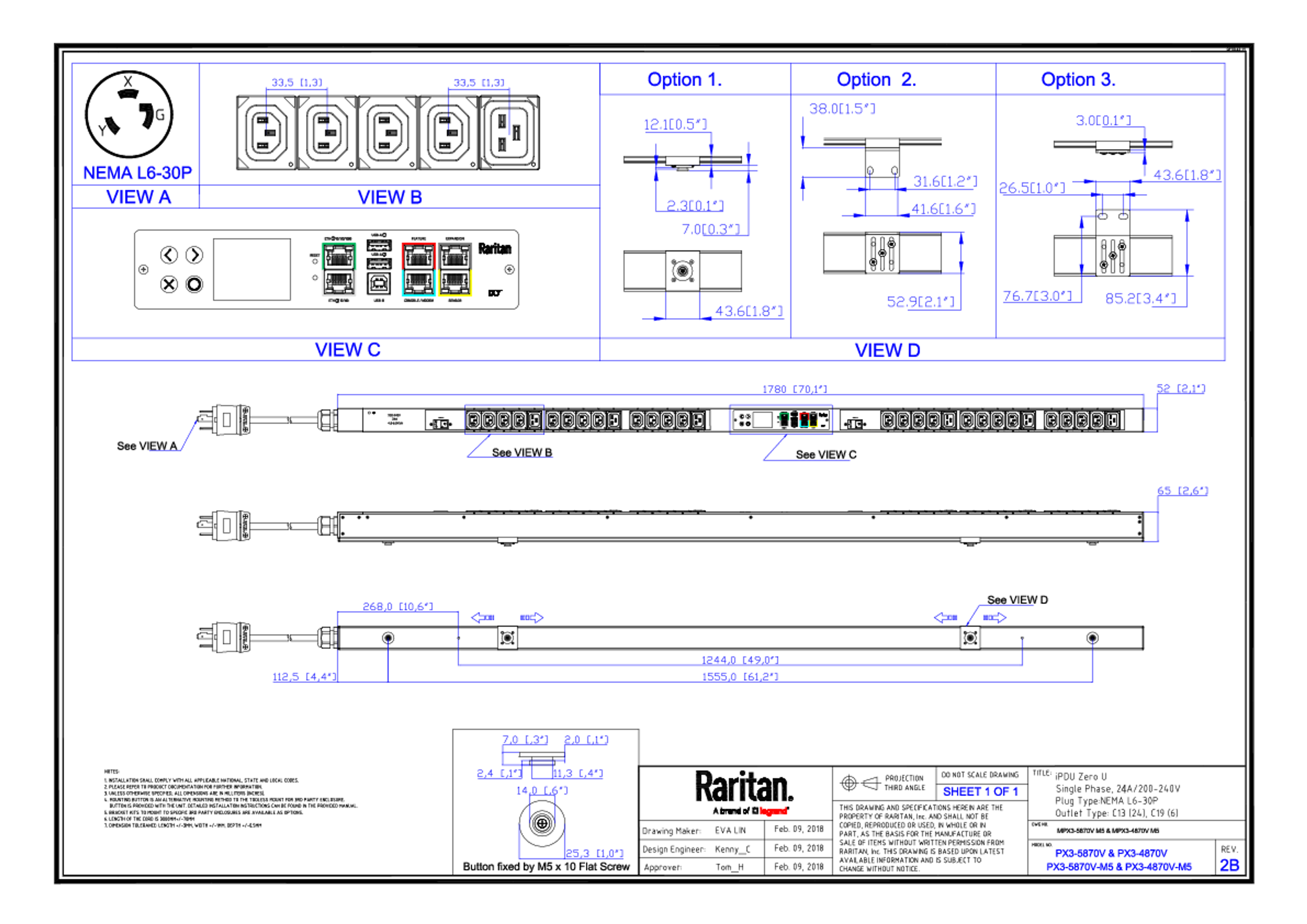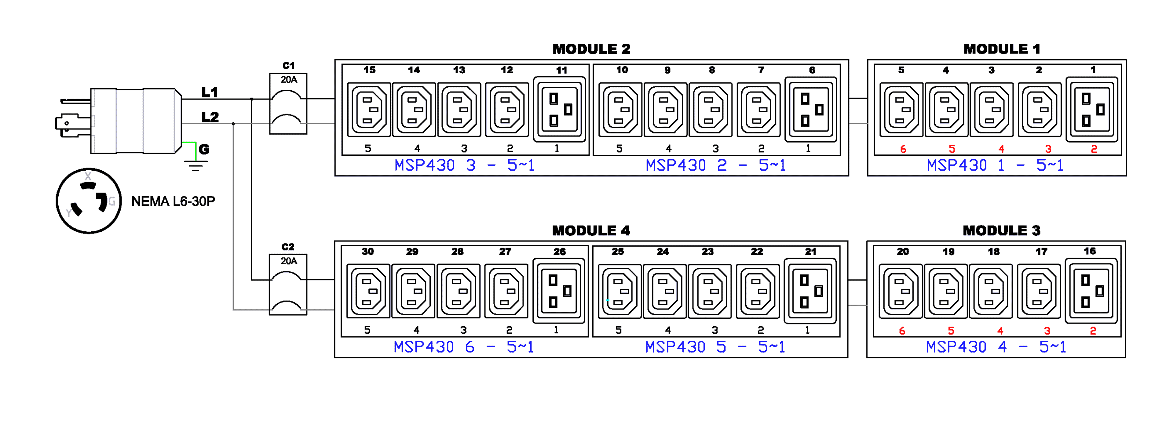 1PH, 208V AC, 30A (24A rated); 30 outlets: 24x C13, 6x C19; plug: NEMA L6-30P (Bottom-bottom feed), 5.0kVA; Outlet Metered/Switched, Zero U vertical PDU
