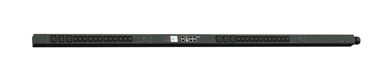 Monitored rack power distribution unit (0U [vertical], 5kVA, 30 outlets). INPUT: 208v, 30a - NEMA L6-30P plug (2P3W); OUTPUT: 24@ C13, 6@ C19 outlets; on 2@ 2-pole, 20a Overcurrent Protectors; FEATURES: Billing-Grade (+/- 1%) Energy Metering [kW, kVA, V, A, Power Factor] - per inlet, per breaker/fuse; Remote network monitoring via HTML, JSON-RPC, SSH, Telnet, MODBUS/TCP, and SNMPv3. Onboard embedded processor with minimum 536MHz clock speed, 16MB SPI Flash, and 64MB DDR2 RAM. Cascading upto 16 PDU's using single Ethernet or USB connection. Environmental monitoring [temp/humidity] capable – up to 32 sensors. Individual outlet numbers labeled on chassis. Automated deployment via TFTP, DHCP, SSH(CLI), or USB Flash Drives. WiFi Capable. USB Webcam Capable. iPad/iPhone/Android App. Dual 10/100/1000 Ethernet port. Breaker metering and alarming (0V detection). Max Dimensions 52mm x 55mm x 1780mm (2.1in x 2.2in x 70.1in). Max Weight 6.4 kg. Maximum ambient temperature 60C at full load.
