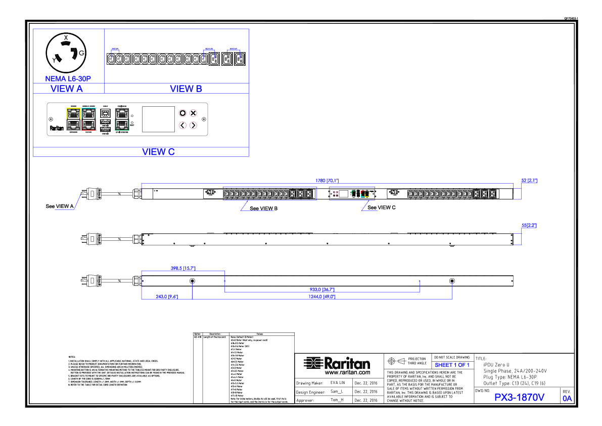 1PH, 208V AC, 30A (24A rated); 30 outlets: 24x C13, 6x C19; plug: NEMA L6-30P (Bottom-bottom feed), 5.0kVA; Unit Metered, Zero U vertical PDU