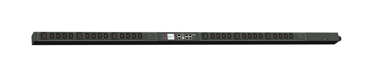 Monitored and switched rack power distribution unit (0U [vertical], 5kVA, 30 outlets). INPUT: 208v, 30a - NEMA L6-30P plug (2P3W); OUTPUT: 24@ C13 Locking, 6@ C19 Locking outlets; on 2@ 2-pole, 20a Overcurrent Protectors; FEATURES: Billing-Grade (+/- 1%) Energy Metering [kW, kVA, V, A, Power Factor] - per inlet, per breaker/fuse, per outlet; Remote network monitoring via HTML, JSON-RPC, SSH, Telnet, MODBUS/TCP, and SNMPv3. Onboard embedded processor with minimum 536MHz clock speed, 16MB SPI Flash, and 64MB DDR2 RAM. Cascading upto 16 PDU's using single Ethernet or USB connection. Environmental monitoring [temp/humidity] capable – up to 32 sensors. Individual outlet numbers labeled on chassis. Automated deployment via TFTP, DHCP, SSH(CLI), or USB Flash Drives. WiFi Capable. USB Webcam Capable. iPad/iPhone/Android App. Dual 10/100/1000 Ethernet port. Tri-color status LED per receptacle. Breaker metering and alarming (0V detection). Max Dimensions 52mm x 71mm x 1780mm (2.1in x 2.8in x 70.1in). Max Weight 6.9 kg. Maximum ambient temperature 60C at full load.