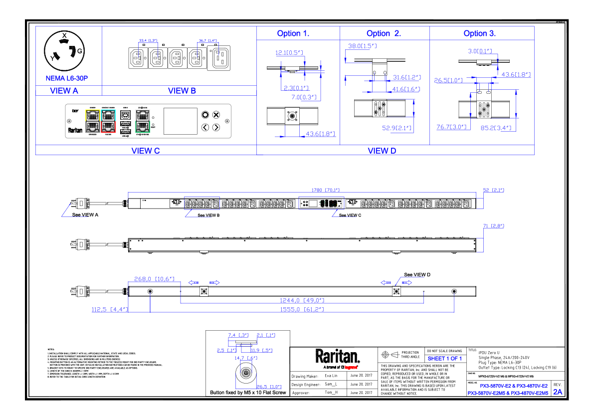 1PH, 208V AC, 30A (24A rated); 30 outlets: 24x Locking C13, 6x Locking C19; plug: NEMA L6-30P (Bottom-bottom feed), 5.0kVA; Outlet Metered, Zero U vertical PDU