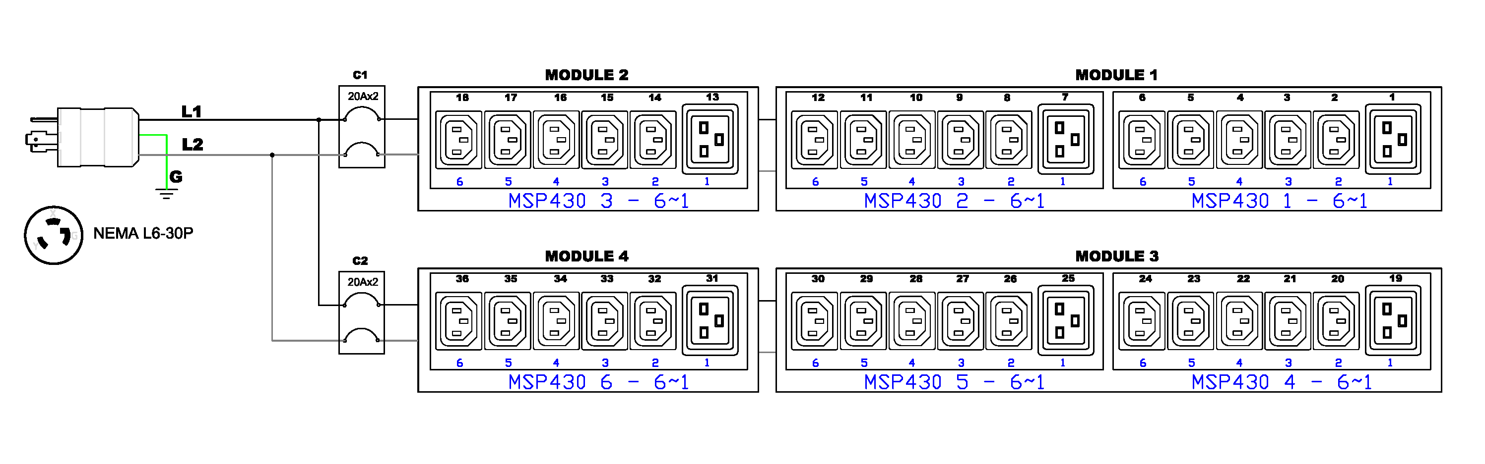 1PH, 208V AC, 30A (24A rated); 36 outlets: 30x C13, 6x C19; plug: NEMA L6-30P (Bottom-bottom feed), 5.0kVA; Outlet Metered/Switched, Zero U vertical PDU