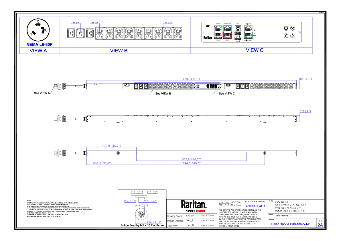 1PH, 208V AC, 30A (24A rated); 42 outlets: 36x C13, 6x C19; plug: NEMA L6-30P (Bottom-bottom feed), 5.0kVA; Unit Metered, Zero U vertical PDU