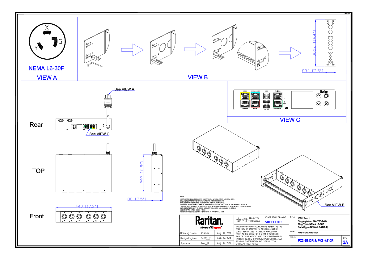 1PH, 208V AC, 30A (24A rated); 6 outlets: 6x NEMA L6-20R; plug: NEMA L6-30P (Rear feed), 5.0kVA; Outlet Metered/Switched, 2U horizontal PDU