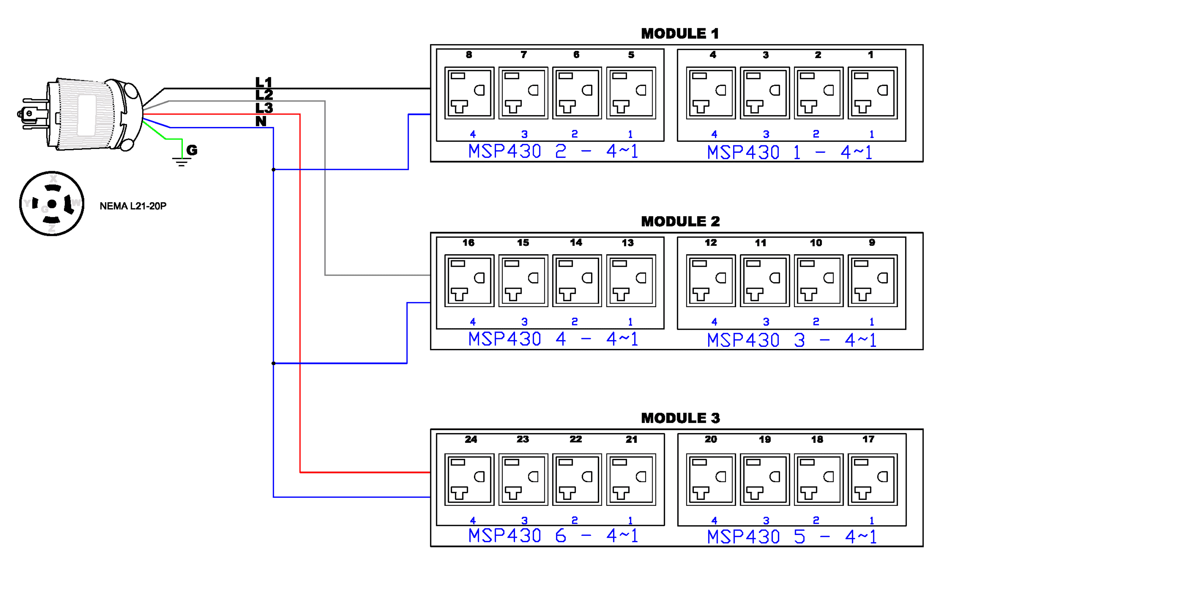 3PH, 208V AC, 20A (16A/PH rated); 24 outlets: 24x NEMA 5-20R; plug: NEMA L21-20P (Wye Bottom-front feed), 5.8kVA; Outlet Metered/Switched, Zero U vertical PDU