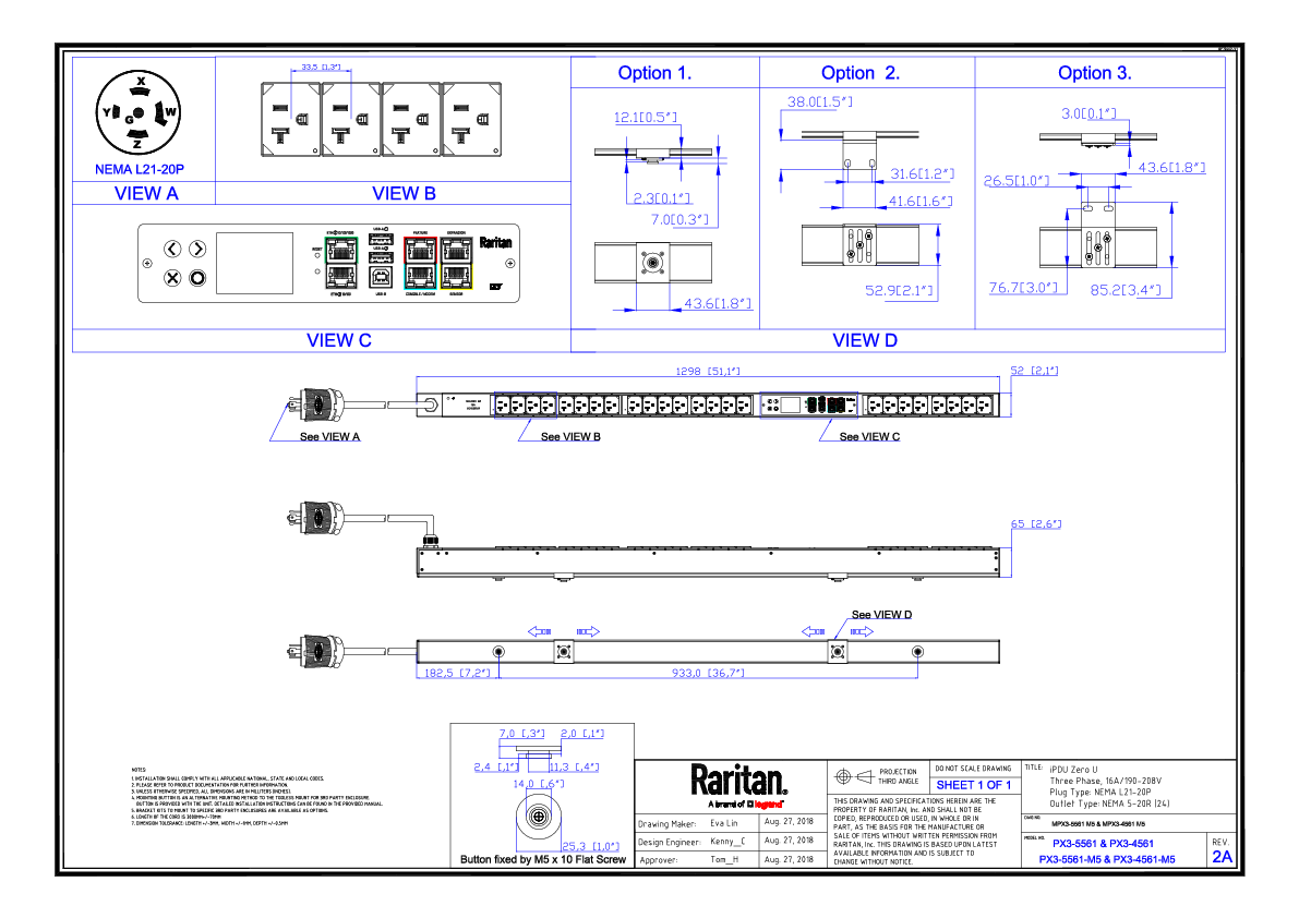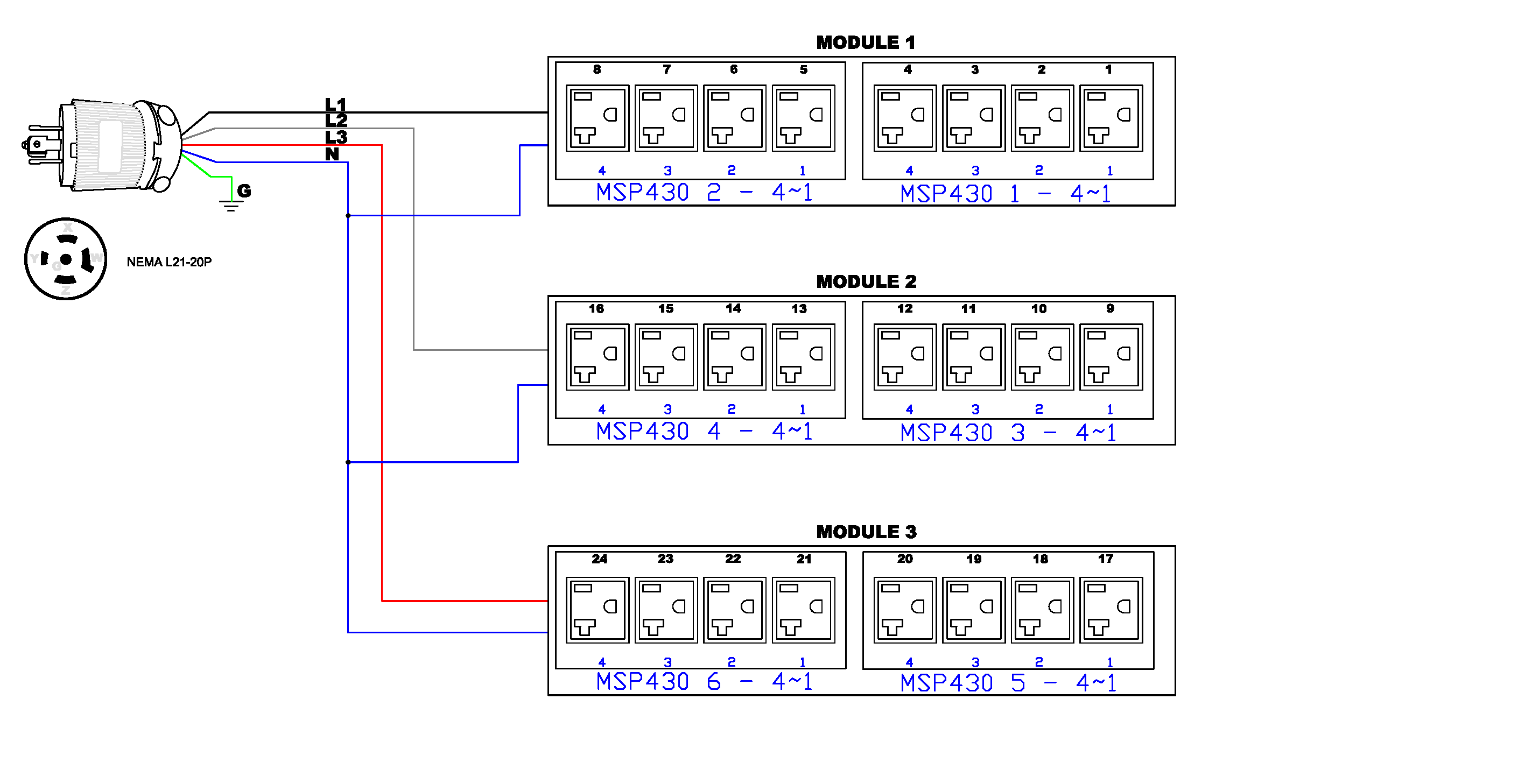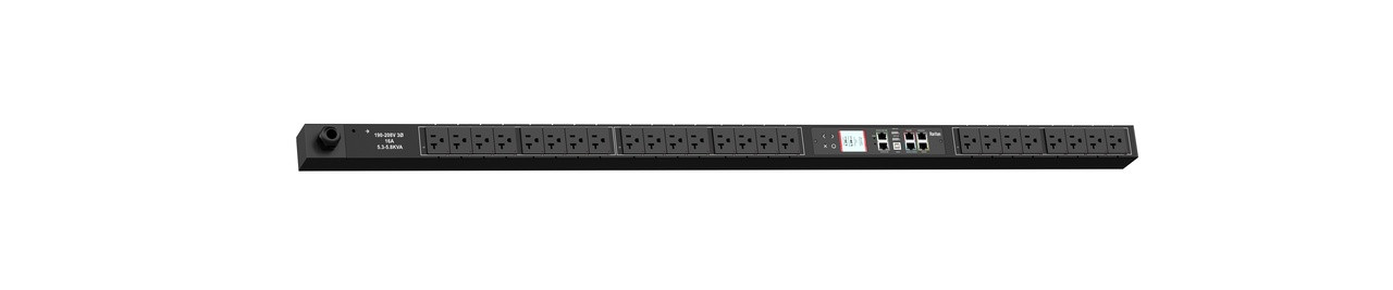 3PH, 208V AC, 20A (16A/PH rated); 24 outlets: 24x NEMA 5-20R; plug: NEMA L21-20P (Wye Bottom-front feed), 5.8kVA; Outlet Metered/Switched, Zero U vertical PDU