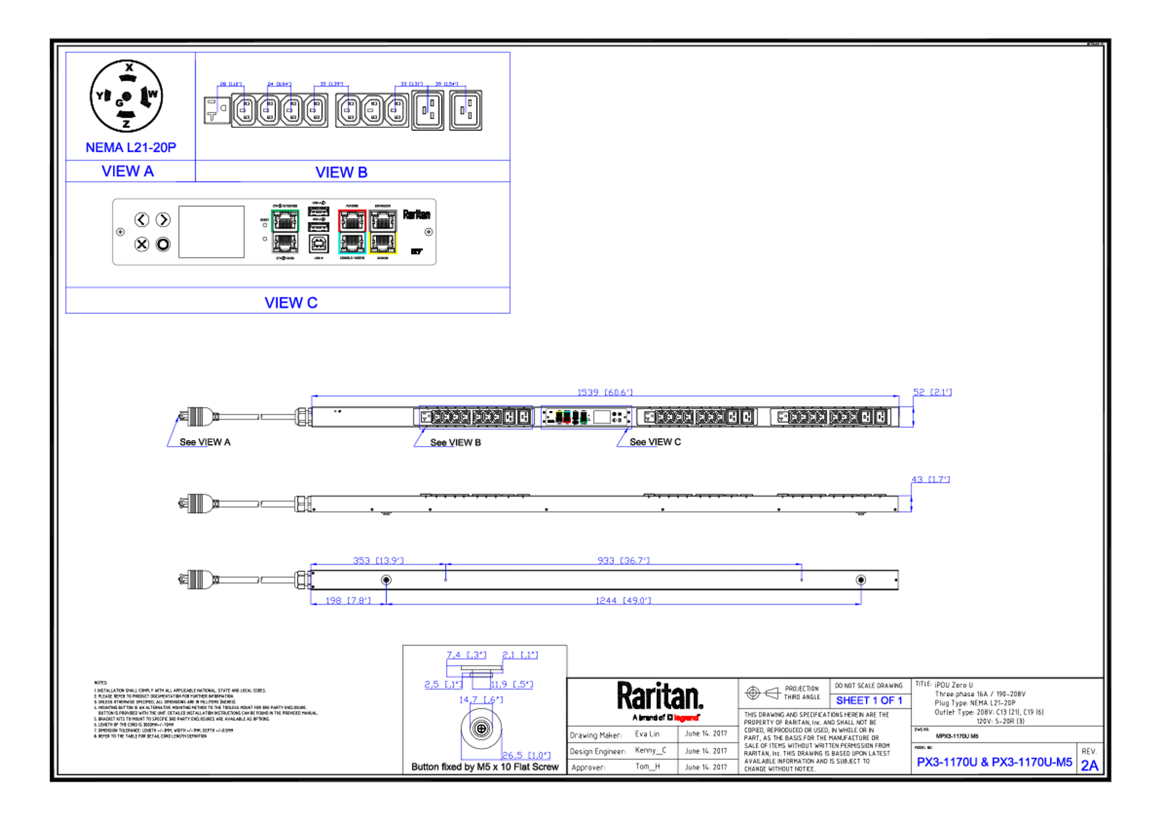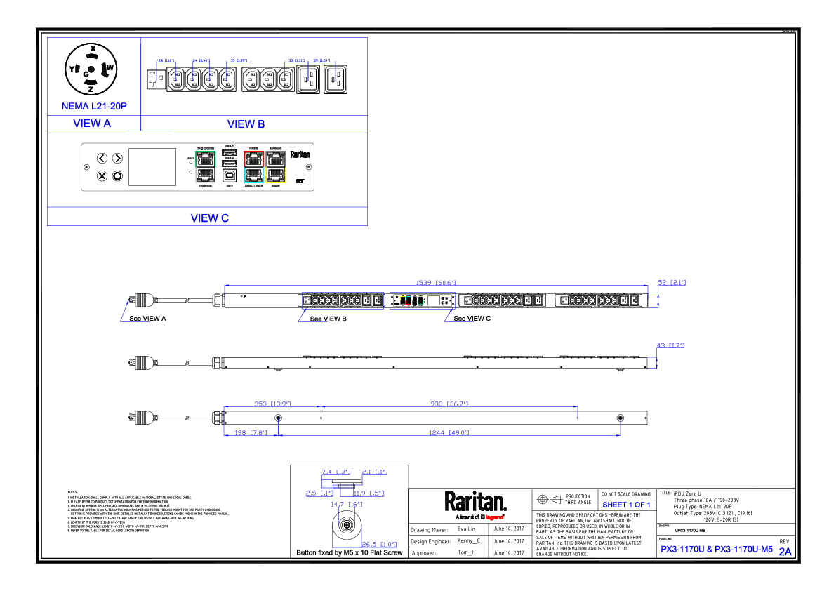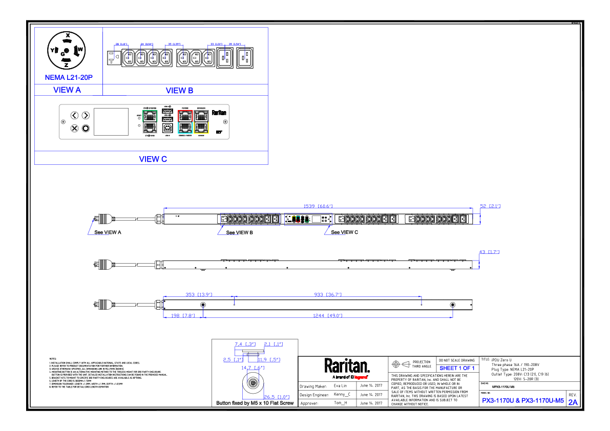 3PH, 208V AC, 20A (16A/PH rated); 30 outlets: 21x C13, 6x C19, 3x NEMA 5-20R; plug: NEMA L21-20P (Wye Top-top feed), 5.8kVA; Unit Metered, Zero U vertical PDU