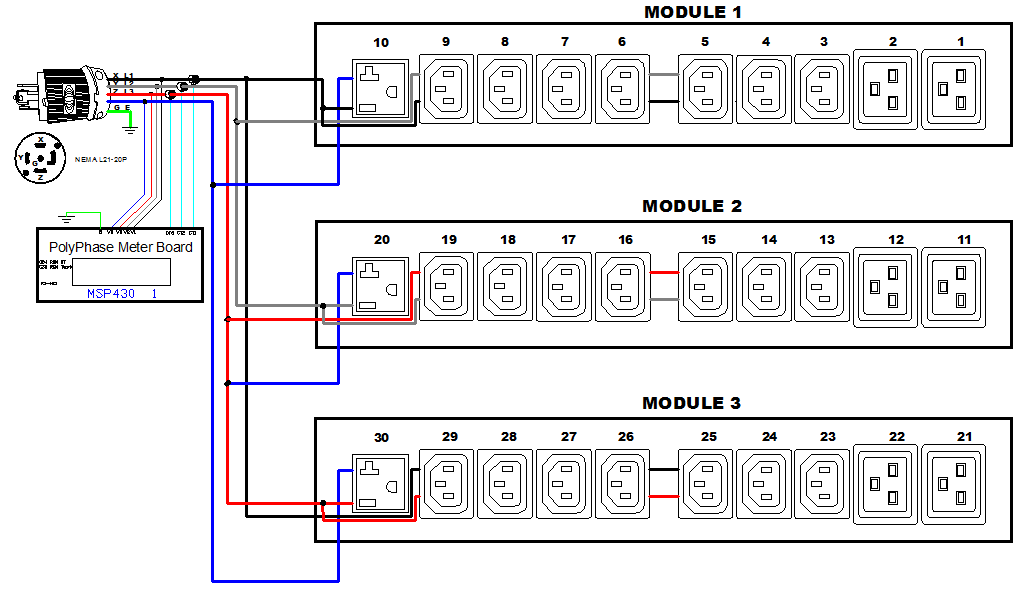 3PH, 208V AC, 20A (16A/PH rated); 30 outlets: 21x C13, 6x C19, 3x NEMA 5-20R; plug: NEMA L21-20P (Wye Top-top feed), 5.8kVA; Unit Metered, Zero U vertical PDU