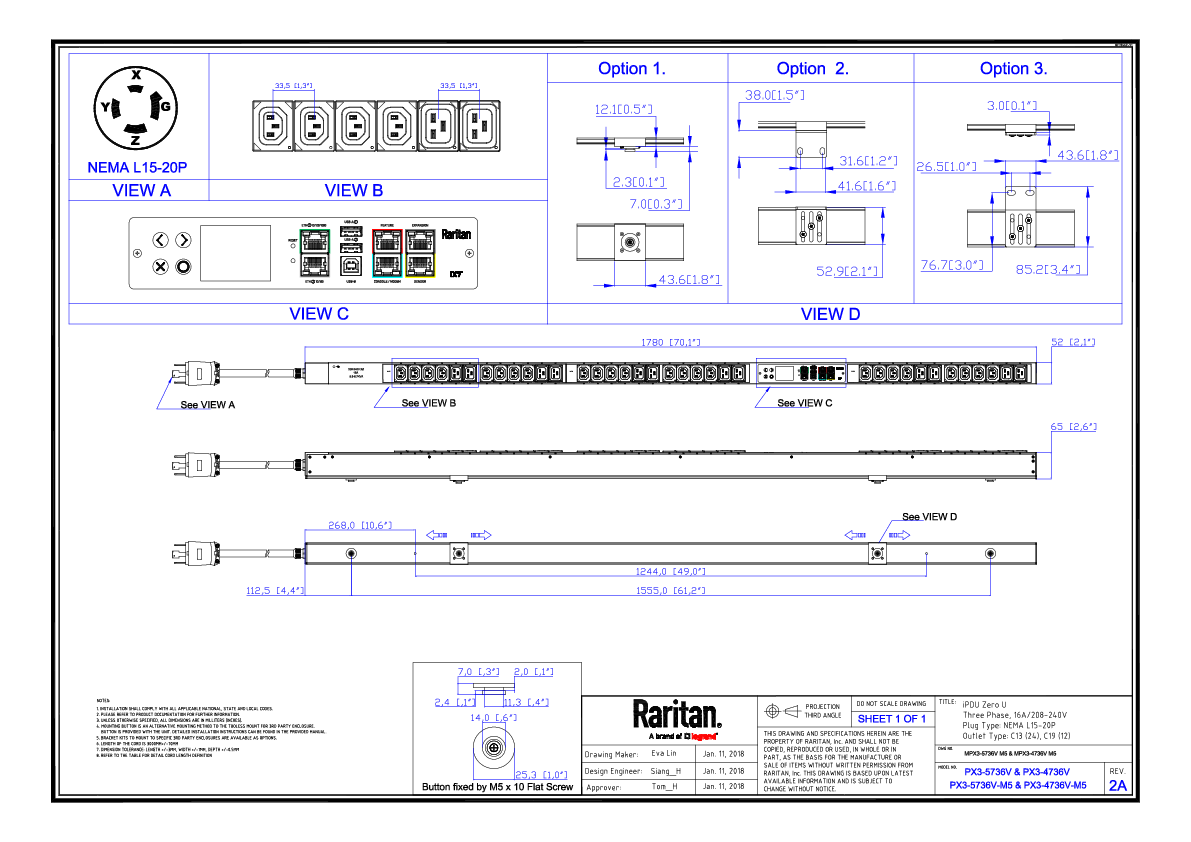 3PH, 208V AC, 20A (16A/PH rated); 36 outlets: 24x C13, 12x C19; plug: NEMA L15-20P (Delta Bottom-bottom feed), 5.8kVA; Outlet Metered/Switched, Zero U vertical PDU