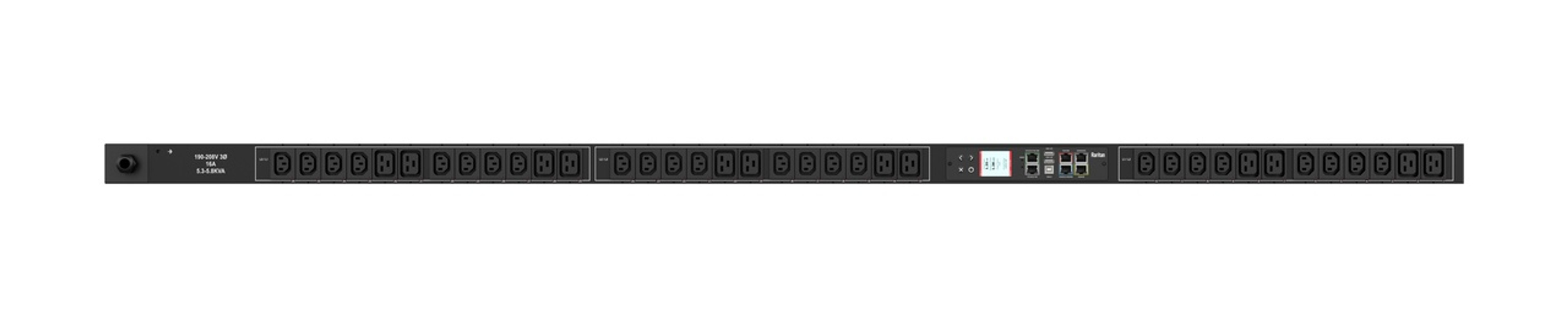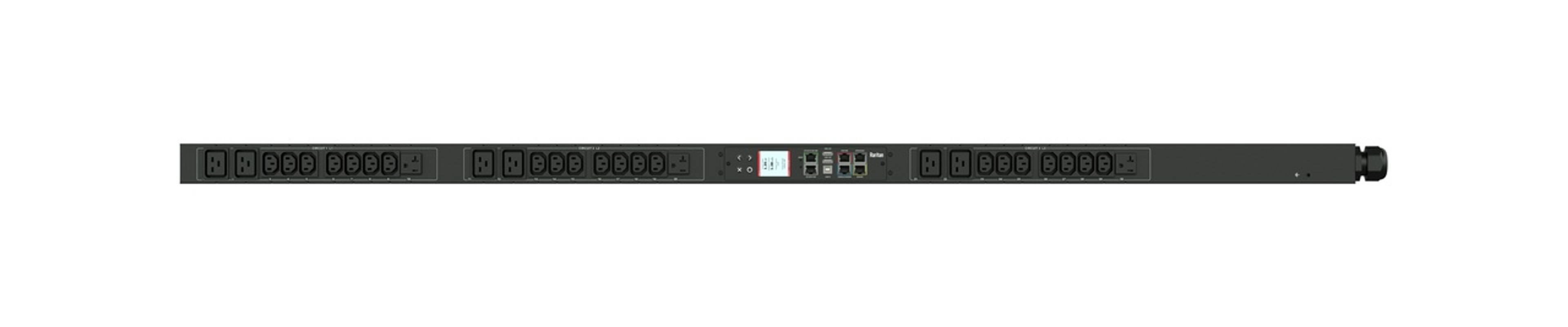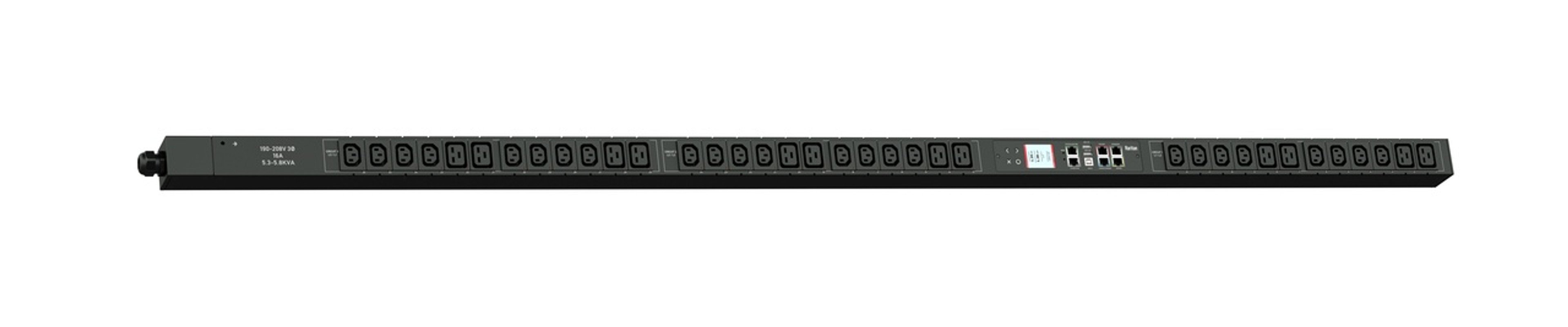 3PH, 208V AC, 20A (16A/PH rated); 36 outlets: 24x C13, 12x C19; plug: NEMA L21-20P (Wye Bottom-bottom feed), 5.8kVA; Outlet Metered/Switched, Zero U vertical PDU