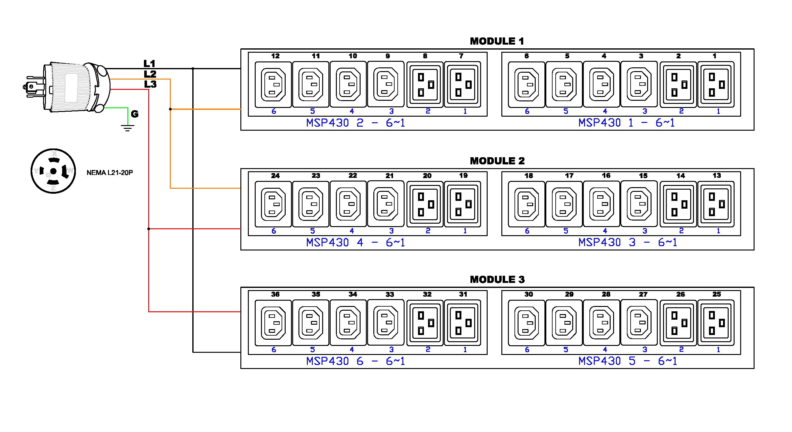 3PH, 208V AC, 20A (16A/PH rated); 36 outlets: 24x C13, 12x C19; plug: NEMA L21-20P (Wye Bottom-bottom feed), 5.8kVA; Outlet Metered/Switched, Zero U vertical PDU
