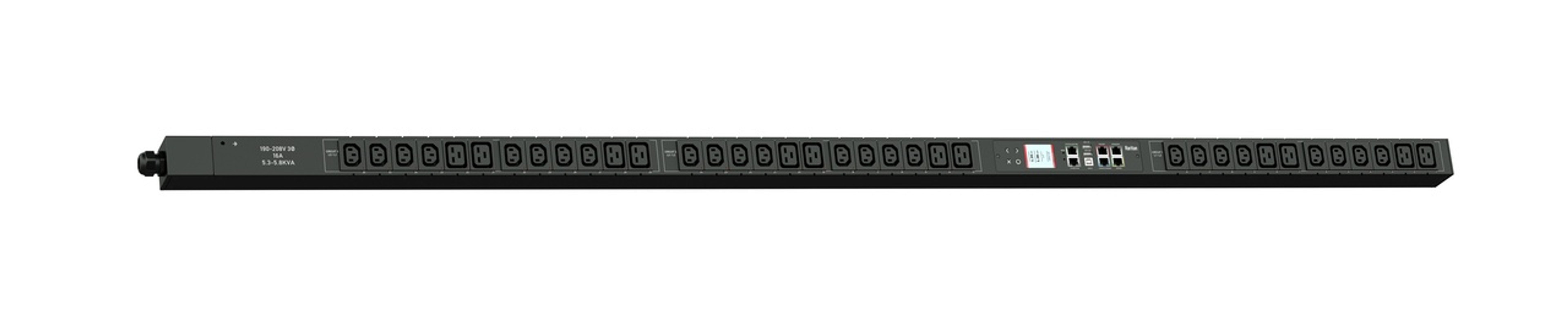 Monitored rack power distribution unit (0U [vertical], 5.8kVA, 36 outlets). INPUT: 208v (3-phase DELTA), 20a - NEMA L21-20P plug (4P5W); OUTPUT: 24@ C13, 12@ C19 outlets; FEATURES: Billing-Grade (+/- 1%) Energy Metering [kW, kVA, V, A, Power Factor] - per inlet, per outlet; Remote network monitoring via HTML, JSON-RPC, SSH, Telnet, MODBUS/TCP, and SNMPv3. Onboard embedded processor with minimum 536MHz clock speed, 16MB SPI Flash, and 64MB DDR2 RAM. Cascading upto 16 PDU's using single Ethernet or USB connection. Environmental monitoring [temp/humidity] capable – up to 32 sensors. Individual outlet numbers labeled on chassis. Automated deployment via TFTP, DHCP, SSH(CLI), or USB Flash Drives. WiFi Capable. USB Webcam Capable. iPad/iPhone/Android App. Dual 10/100/1000 Ethernet port. Tri-color status LED per receptacle. Max Dimensions 52mm x 65mm x 1780mm (2.1in x 2.6in x 70.1in). Max Weight TBD. Maximum ambient temperature 60C at full load.