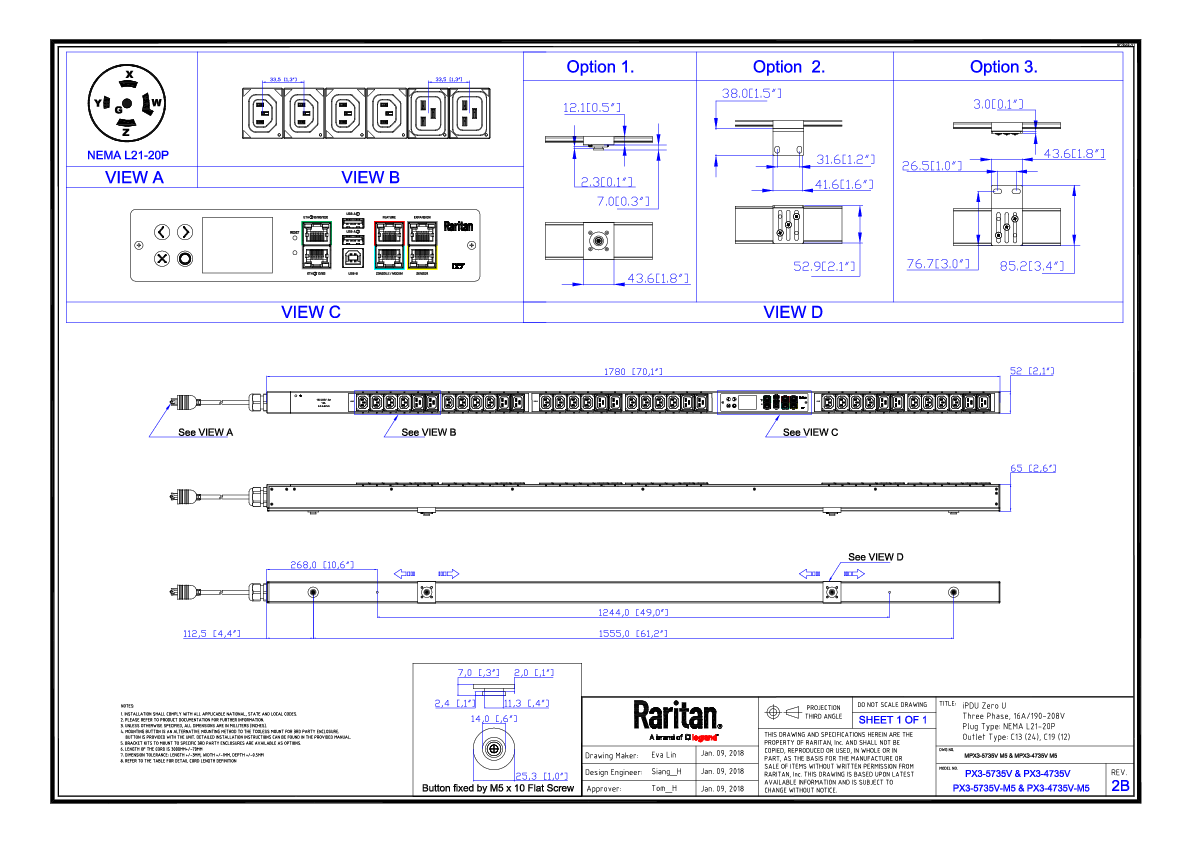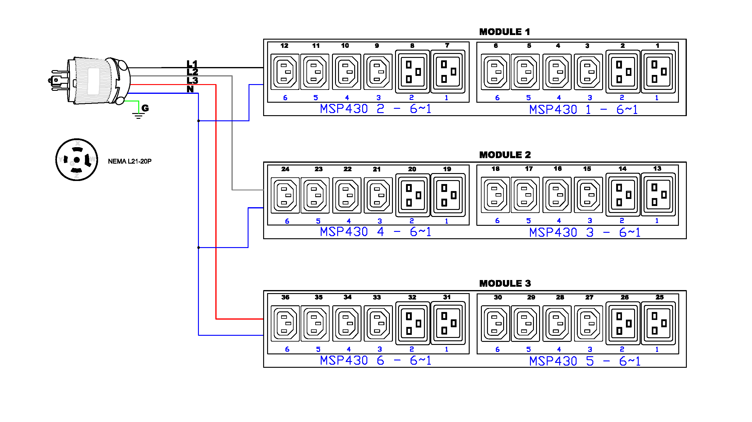 3PH, 208V AC, 20A (16A/PH rated); 36 outlets: 24x C13, 12x C19; plug: NEMA L21-20P (Wye Bottom-bottom feed), 5.8kVA; Outlet Metered, Zero U vertical PDU