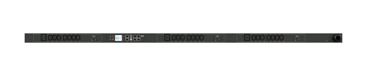 Monitored and switched rack power distribution unit (0U [vertical], 8.6kVA, 24 outlets). INPUT: 208v (3-phase WYE), 30a - NEMA L21-30P plug (4P5W); OUTPUT: 24@ 5-20R outlets; on 6@ 1-pole, 20a Overcurrent Protectors; FEATURES: Billing-Grade (+/- 1%) Energy Metering [kW, kVA, V, A, Power Factor] - per inlet, per breaker/fuse, per outlet; Remote network monitoring via HTML, JSON-RPC, SSH, Telnet, MODBUS/TCP, and SNMPv3. Onboard embedded processor with minimum 536MHz clock speed, 16MB SPI Flash, and 64MB DDR2 RAM. Cascading upto 16 PDU's using single Ethernet or USB connection. Environmental monitoring [temp/humidity] capable – up to 32 sensors. Individual outlet numbers labeled on chassis. Automated deployment via TFTP, DHCP, SSH(CLI), or USB Flash Drives. WiFi Capable. USB Webcam Capable. iPad/iPhone/Android App. Dual 10/100/1000 Ethernet port. Tri-color status LED per receptacle. Breaker metering and alarming (0V detection). Max Dimensions 52mm x 65mm x 1780mm (2.1in x 2.6in x 70.1in). Max Weight 8.4 kg. Maximum ambient temperature 60C at full load.