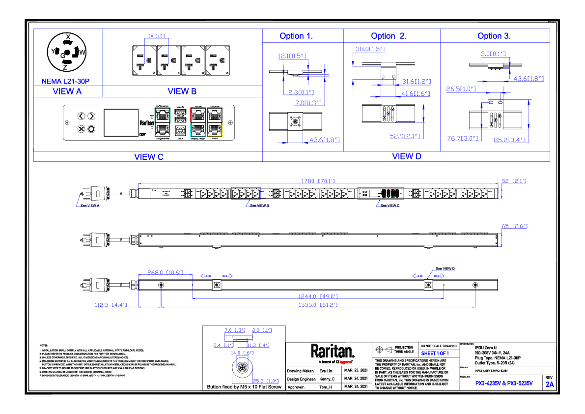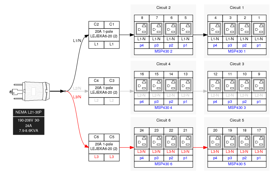 3PH, 208V AC, 30A (24A/PH rated); 24 outlets: 24x NEMA 5-20R; plug: NEMA L21-30P (Wye Bottom-bottom feed), 8.6kVA; Outlet Metered/Switched, Zero U vertical PDU