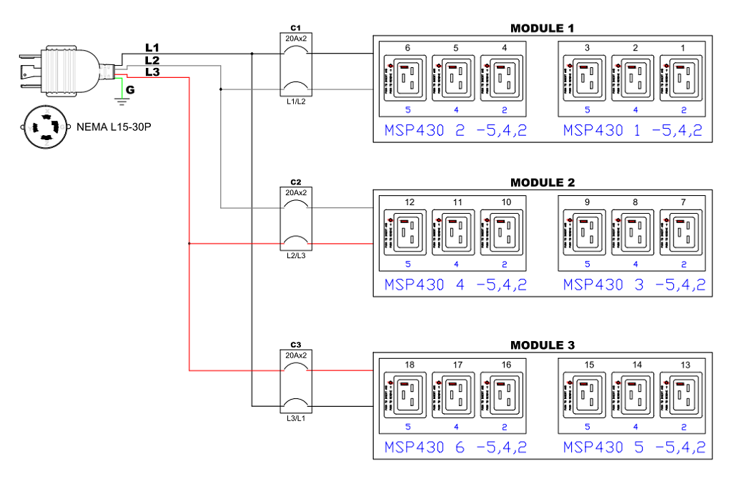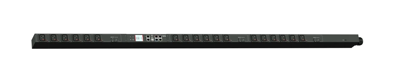 3PH, 208V AC, 30A (24A/PH rated); 18 outlets: 18x C19 Locking; plug: NEMA L15-30P (Delta Bottom-bottom feed), 8.6kVA; Outlet Metered, Zero U vertical PDU