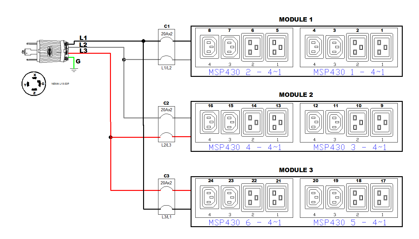 3PH, 208V AC, 30A (24A/PH rated); 24 outlets: 12x C13, 12x C19; plug: NEMA L15-30P (Delta Bottom-front feed), 8.6kVA; Outlet Metered, Zero U vertical PDU
