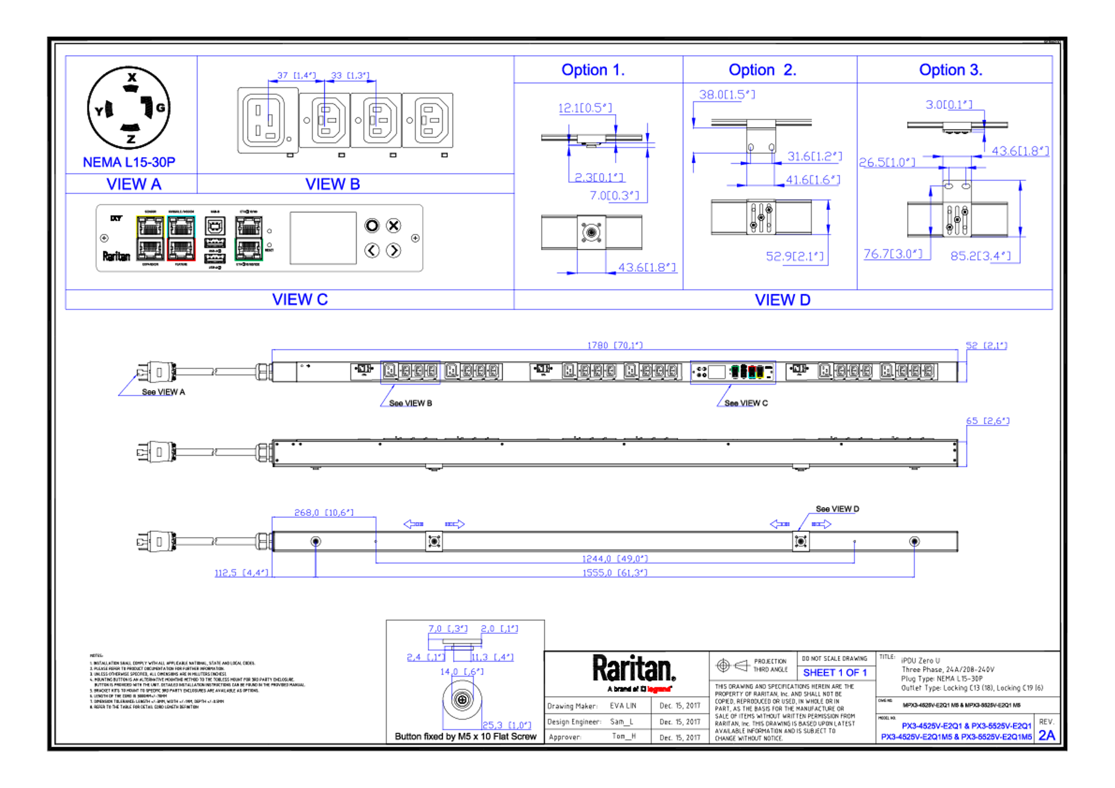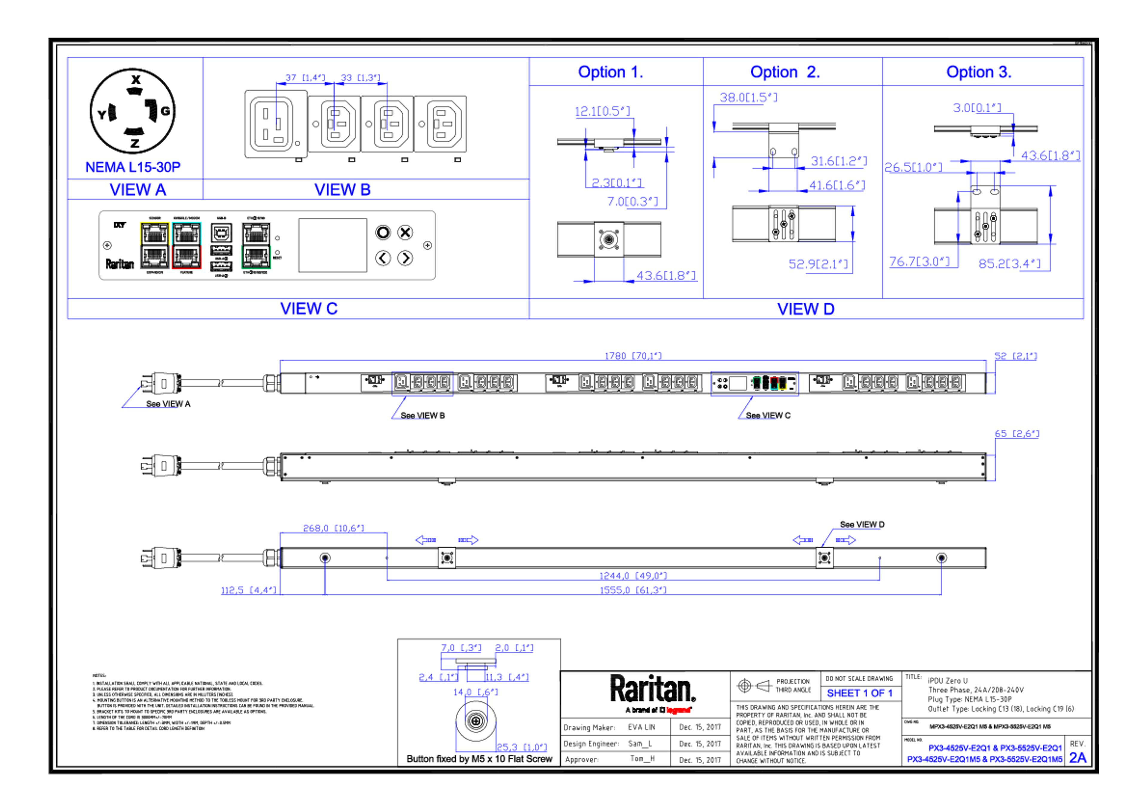 3PH, 208V AC, 30A (24A/PH rated); 24 outlets: 18x C13 Locking, 6x C19 Locking; plug: NEMA L15-30P (Delta Bottom-bottom feed), 8.6kVA; Outlet Metered, Zero U vertical PDU