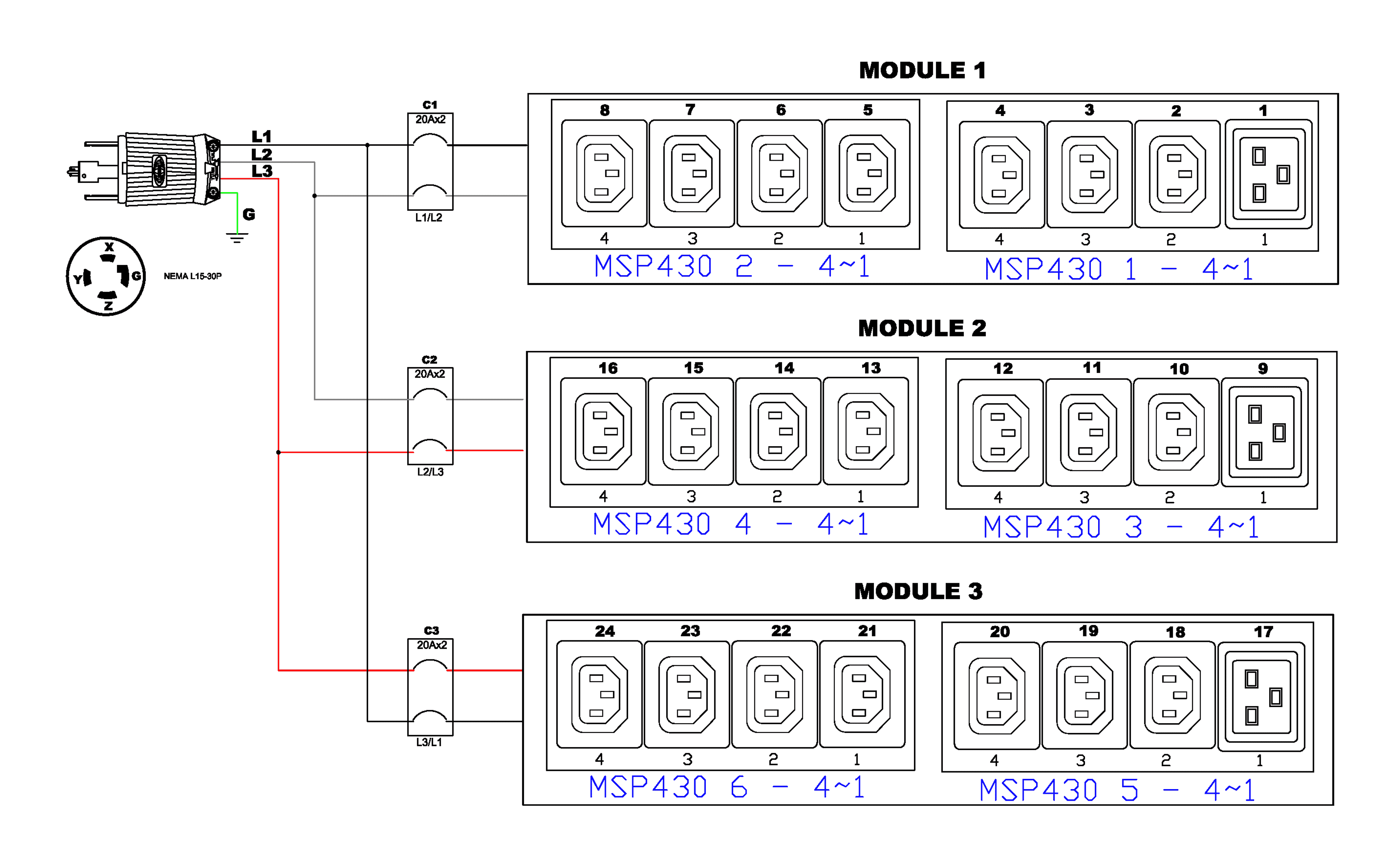 3PH, 208V AC, 30A (24A/PH rated); 24 outlets: 21x C13, 3x C19; plug: NEMA L15-30P (Delta Bottom-front feed), 8.6kVA; Outlet Metered/Switched, Zero U vertical PDU
