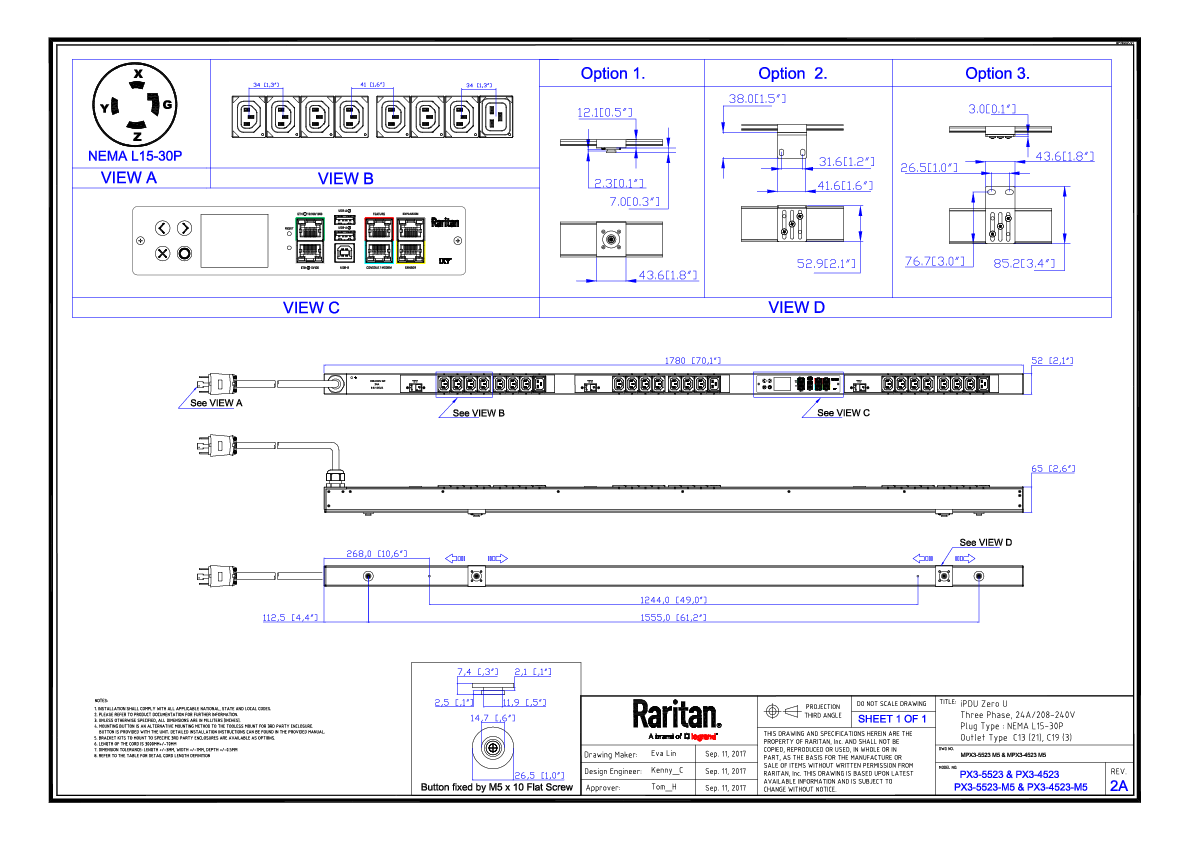Monitored and switched rack power distribution unit (0U [vertical], 8.6kVA, 24 outlets). INPUT: 208v (3-phase DELTA), 30a - NEMA L15-30P plug (3P4W); OUTPUT: 21@ C13, 3@ C19 outlets; on 3@ 2-pole, 20a Overcurrent Protectors; FEATURES: Billing-Grade (+/- 1%) Energy Metering [kW, kVA, V, A, Power Factor] - per inlet, per breaker/fuse, per outlet; Remote network monitoring via HTML, JSON-RPC, SSH, Telnet, MODBUS/TCP, and SNMPv3. Onboard embedded processor with minimum 536MHz clock speed, 16MB SPI Flash, and 64MB DDR2 RAM. Cascading upto 16 PDU's using single Ethernet or USB connection. Environmental monitoring [temp/humidity] capable – up to 32 sensors. Individual outlet numbers labeled on chassis. Automated deployment via TFTP, DHCP, SSH(CLI), or USB Flash Drives. WiFi Capable. USB Webcam Capable. iPad/iPhone/Android App. Dual 10/100/1000 Ethernet port. Tri-color status LED per receptacle. Breaker metering and alarming (0V detection). Max Dimensions 52mm x 65mm x 1780mm (2.1in x 2.6in x 70.1in). Max Weight TBD. Maximum ambient temperature 60C at full load.