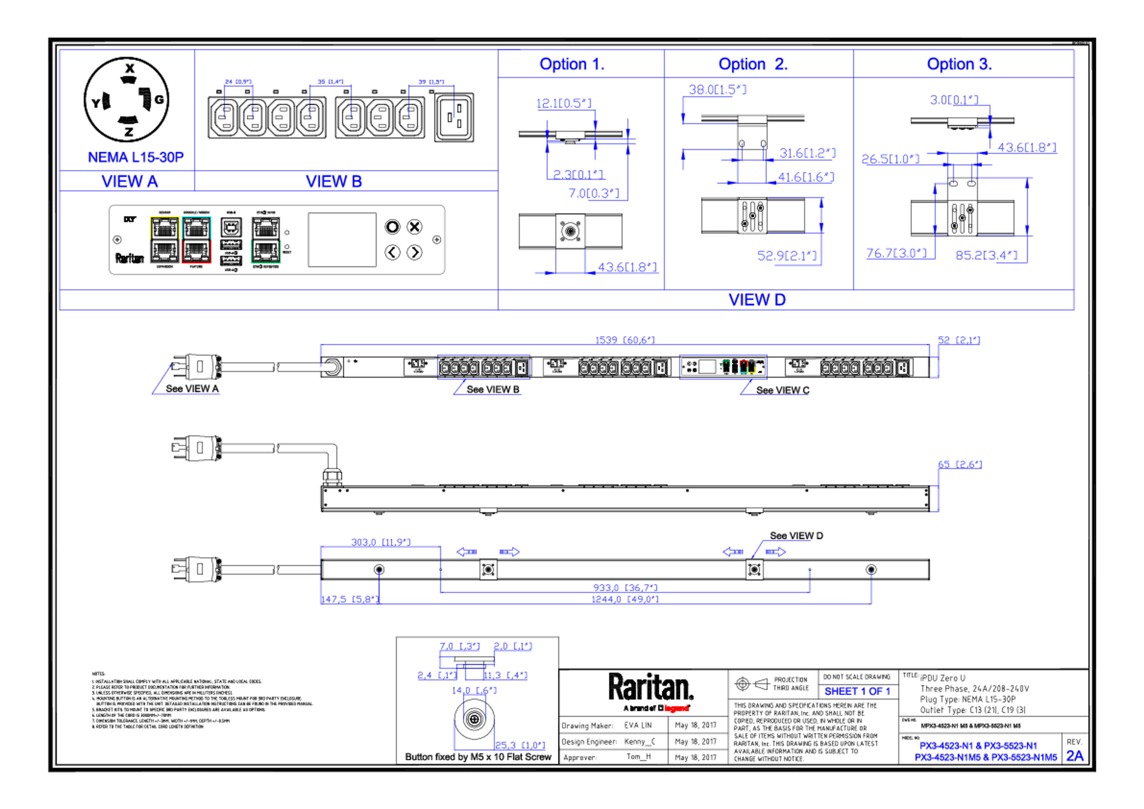 3PH, 208V AC, 30A (24A/PH rated); 24 outlets: 21x C13, 3x C19; plug: NEMA L15-30P (Delta Bottom-front feed), 8.6kVA; Outlet Metered, Zero U vertical PDU