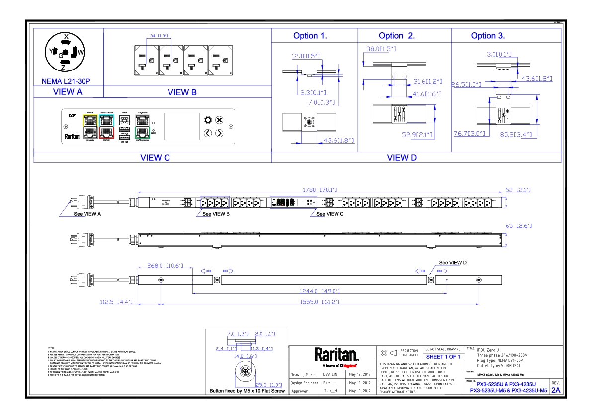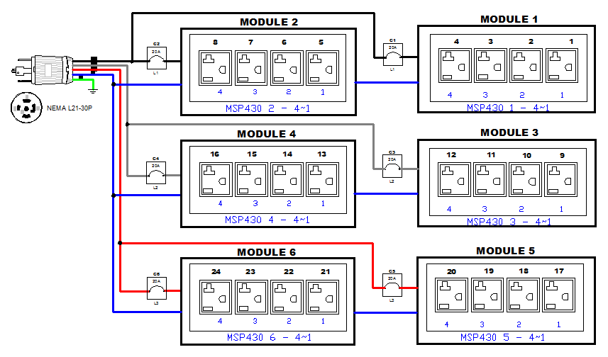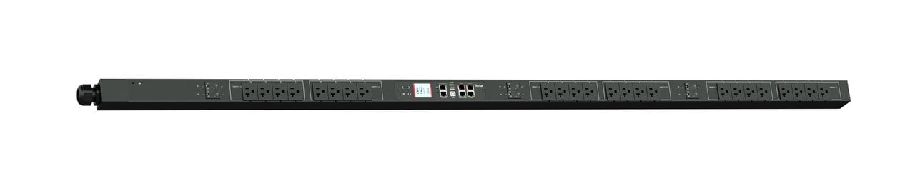 3PH, 208V AC, 30A (24A/PH rated); 24 outlets: 24x NEMA 5-20R; plug: NEMA L21-30P (Wye Top-top feed), 8.6kVA; Outlet Metered/Switched, Zero U vertical PDU
