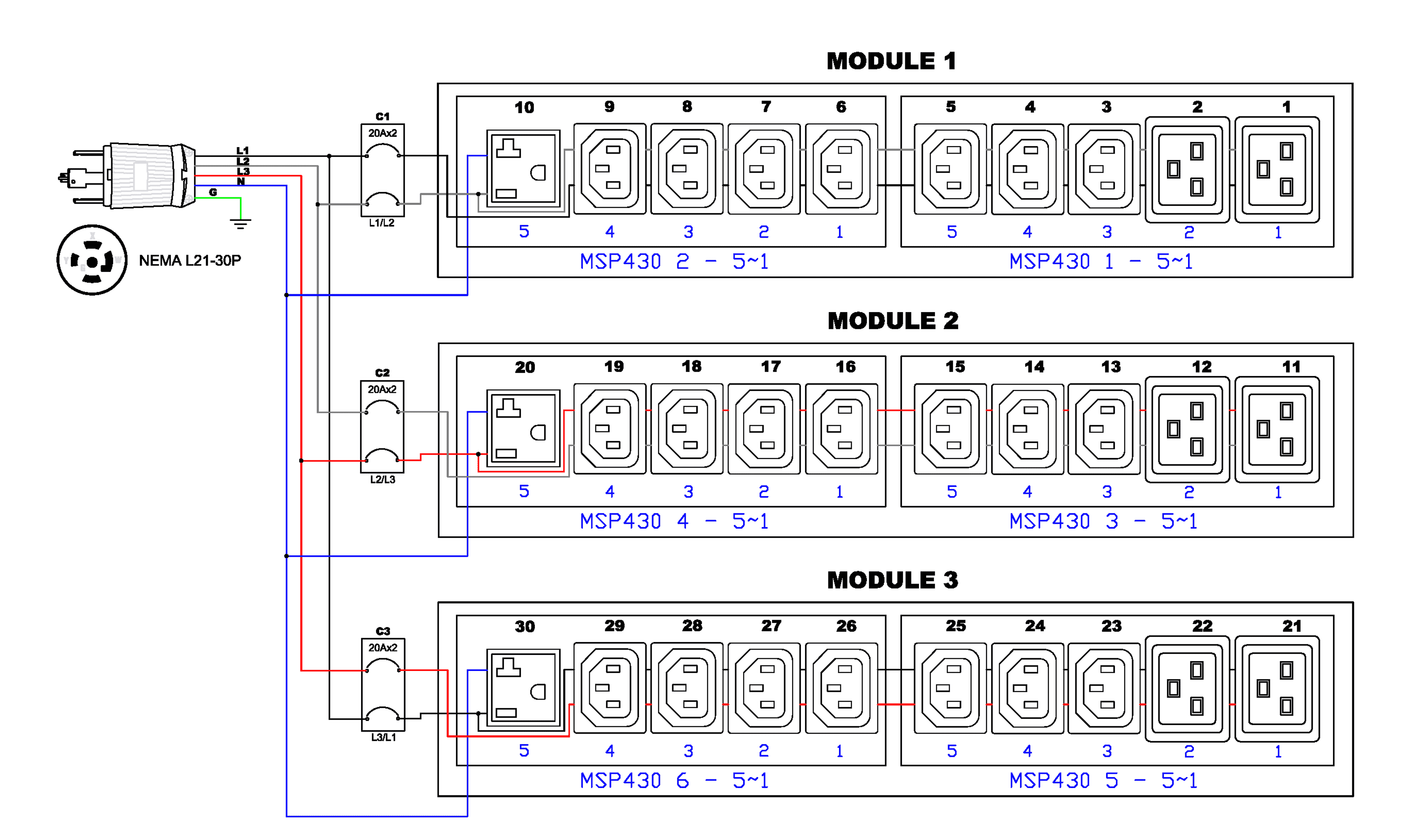 3PH, 208V AC, 30A (24A/PH rated); 30 outlets: 21x C13, 6x C19, 3x NEMA 5-20R; plug: NEMA L21-30P (Wye Bottom-bottom feed), 8.6kVA; Outlet Metered/Switched, Zero U