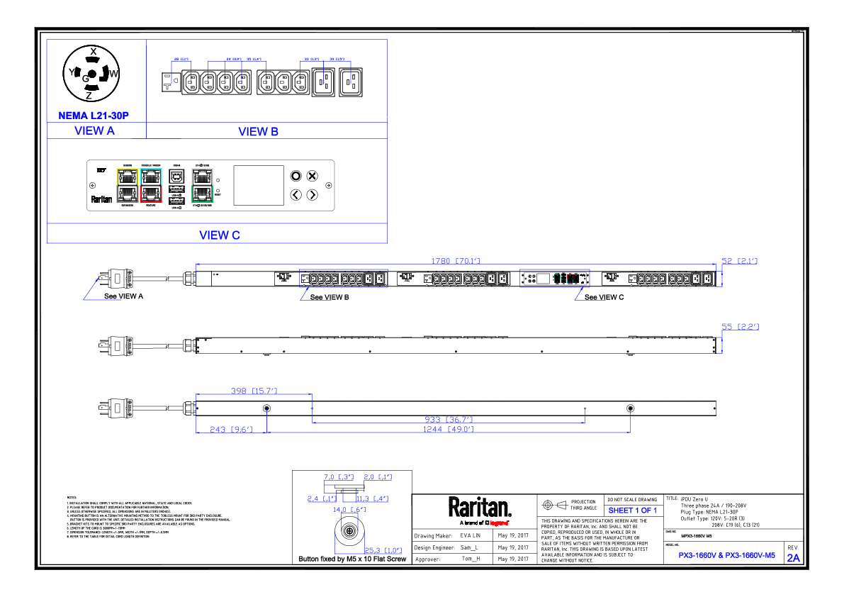 3PH, 208V AC, 30A (24A/PH rated); 30 outlets: 21x C13, 6x C19, 3x NEMA 5-20R; plug: NEMA L21-30P (Wye Bottom-bottom feed), 8.6kVA; Unit Metered, Zero U vertical PDU