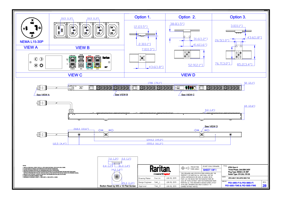 3PH, 208V AC, 30A (24A/PH rated); 30 outlets: 24x C13, 6x C19; plug: NEMA L15-30P (Delta Bottom-bottom feed), 8.6kVA; Outlet Metered, Zero U vertical PDU