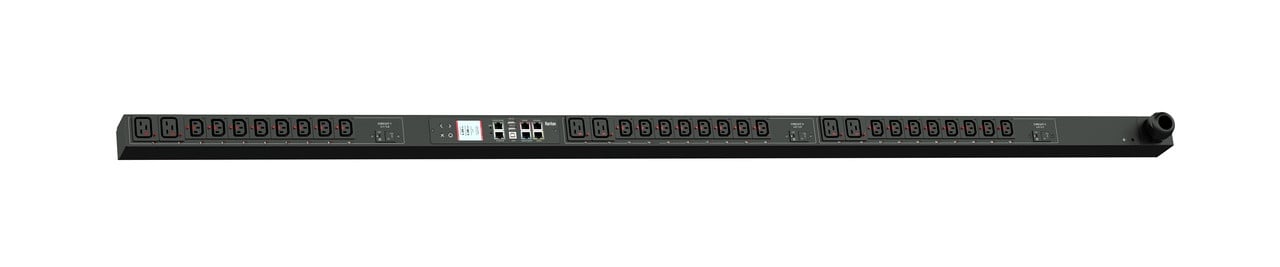 Monitored rack power distribution unit (0U [vertical], 8.6kVA, 30 outlets). INPUT: 208v (3-phase DELTA), 30a - NEMA L21-30P plug (4P5W); OUTPUT: 24@ C13 Locking, 6@ C19 Locking outlets; on 3@ 2-pole, 20a Overcurrent Protectors; FEATURES: Billing-Grade (+/- 1%) Energy Metering [kW, kVA, V, A, Power Factor] - per inlet, per breaker/fuse, per outlet; Remote network monitoring via HTML, JSON-RPC, SSH, Telnet, MODBUS/TCP, and SNMPv3. Onboard embedded processor with minimum 536MHz clock speed, 16MB SPI Flash, and 64MB DDR2 RAM. Cascading upto 16 PDU's using single Ethernet or USB connection. Environmental monitoring [temp/humidity] capable – up to 32 sensors. Individual outlet numbers labeled on chassis. Automated deployment via TFTP, DHCP, SSH(CLI), or USB Flash Drives. WiFi Capable. USB Webcam Capable. iPad/iPhone/Android App. Dual 10/100/1000 Ethernet port. Tri-color status LED per receptacle. Breaker metering and alarming (0V detection). Max Dimensions 52mm x 71mm x 1780mm (2.1in x 2.8in x 70.1in). Max Weight 6.7 kg. Maximum ambient temperature 60C at full load.