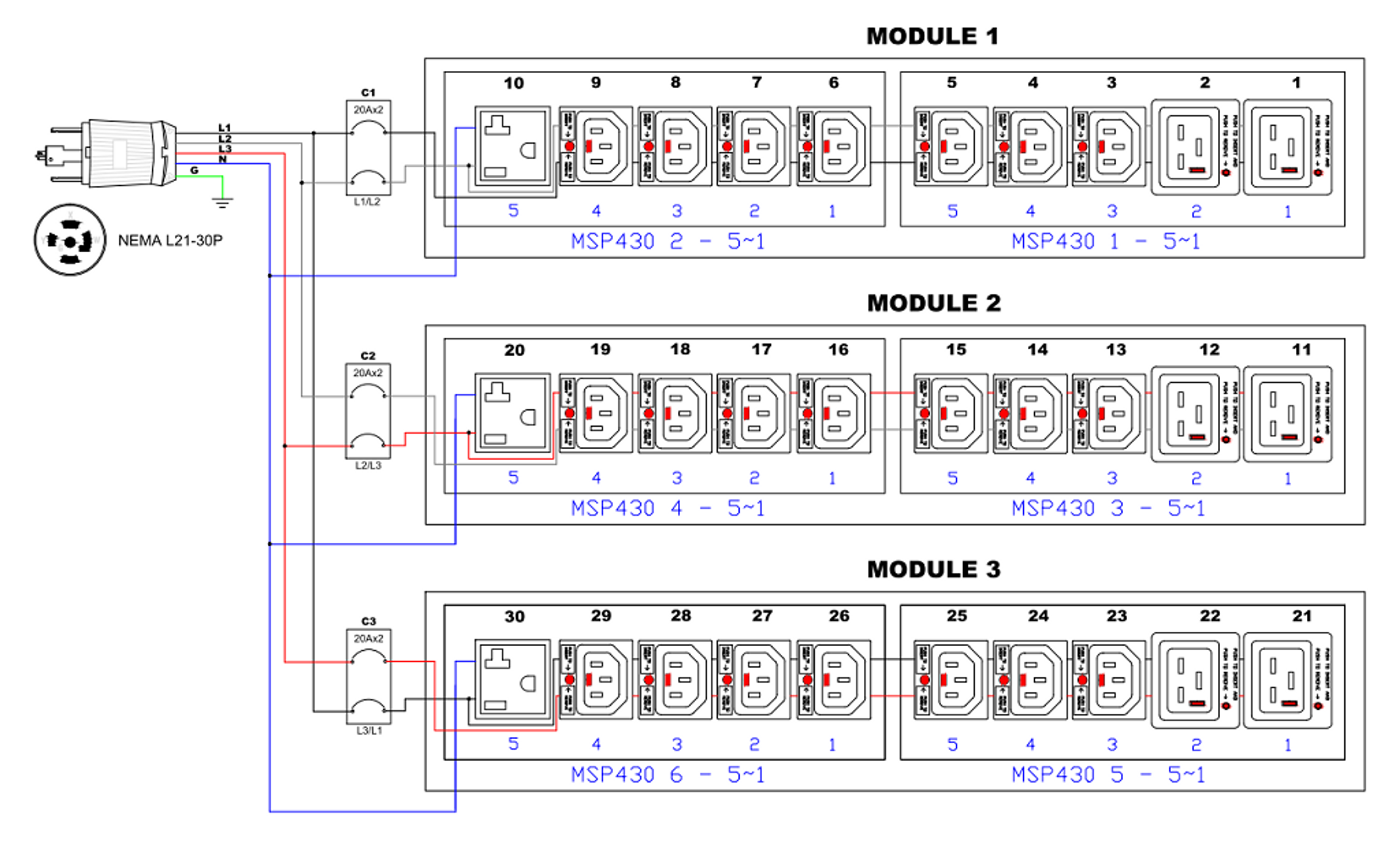 3PH, 208V AC, 30A (24A/PH rated); 30 outlets: 3x NEMA 5-20R, 21x C13 Locking, 6x C19 Locking; plug: NEMA L21-30P (Wye Bottom-bottom feed), 8.6kVA; Outlet Metered, Zero U vertical PDU