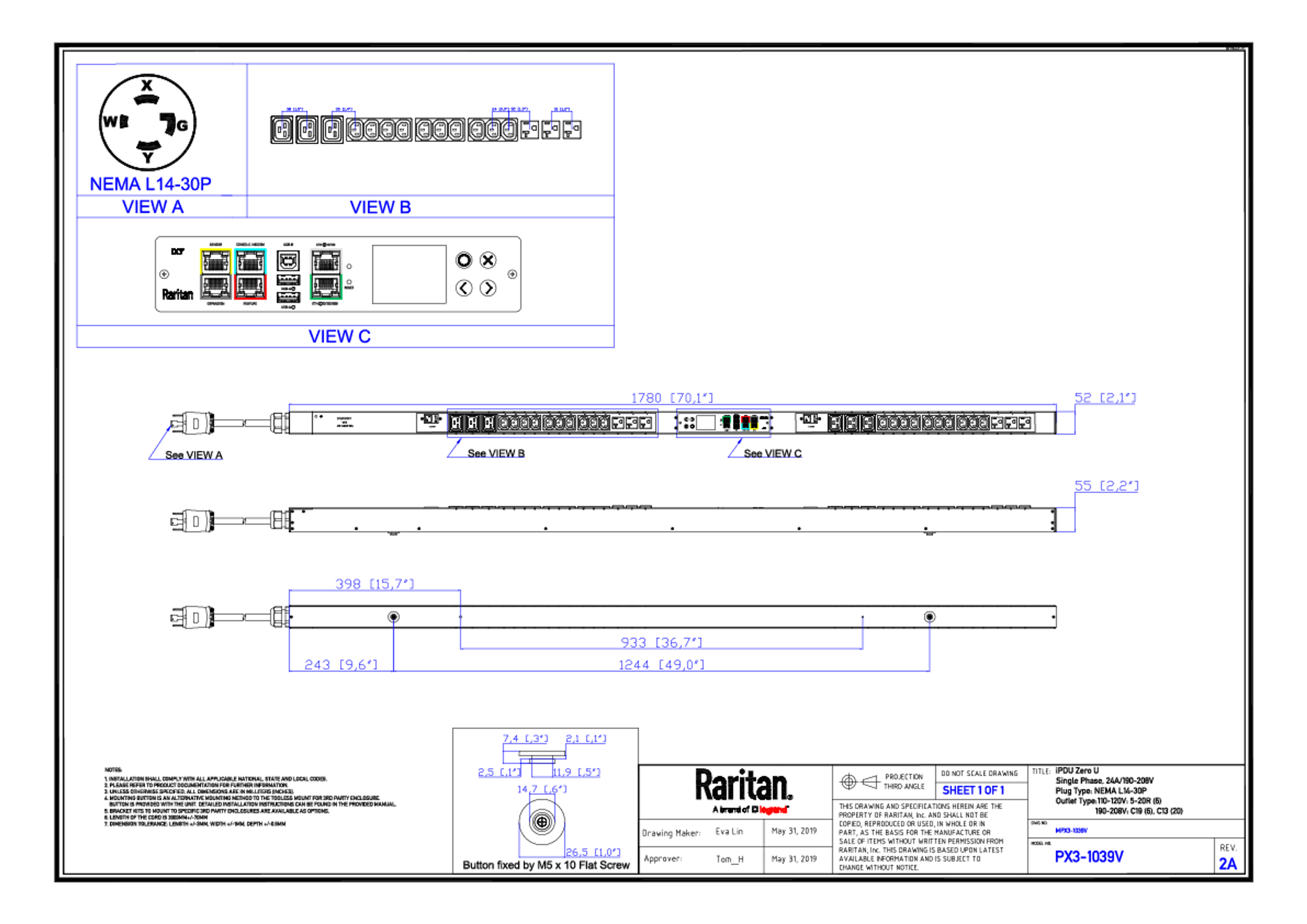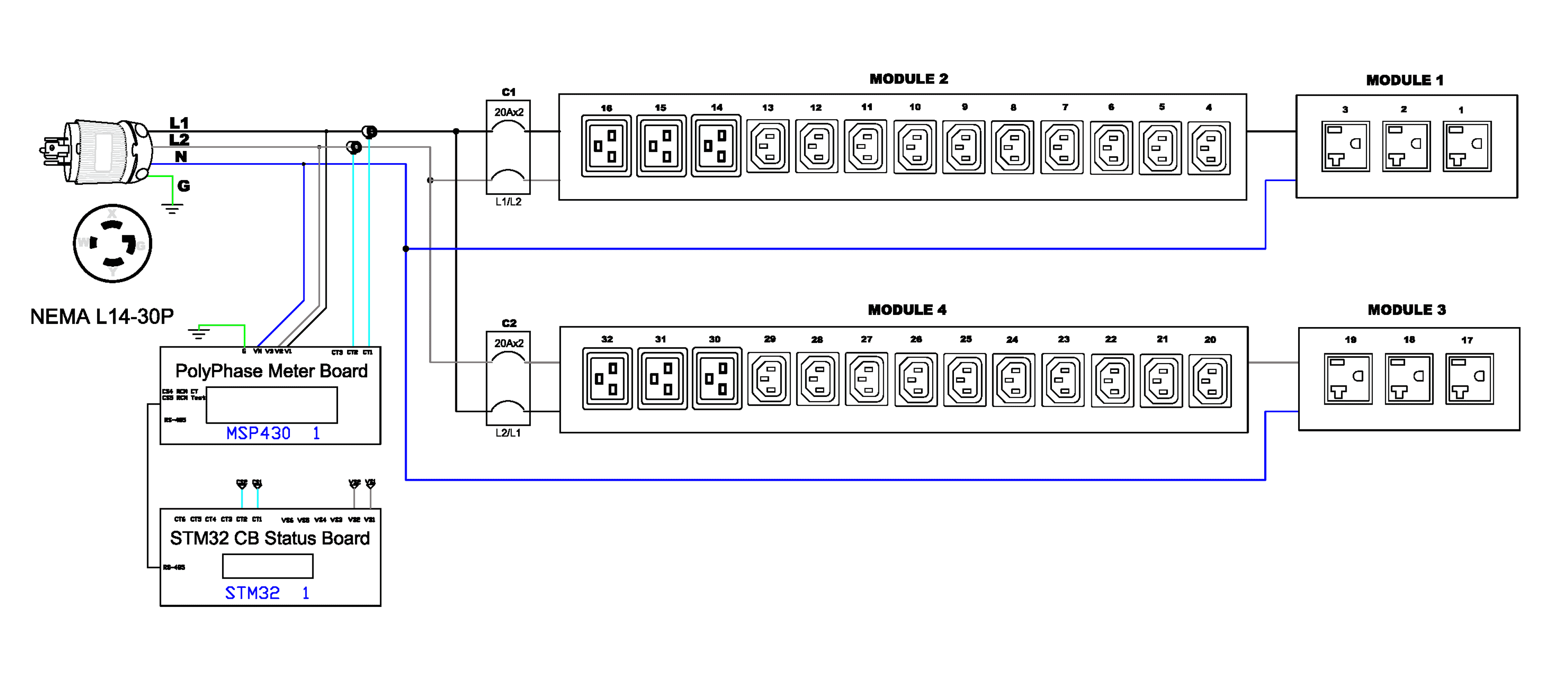 3PH, 208V AC, 30A (24A/PH rated); 32 outlets: 20x C13, 6x C19, 6x NEMA 5-20R; plug: NEMA L14-30P (Wye Bottom-bottom feed), 8.6kVA; Unit Metered, Zero U vertical PDU