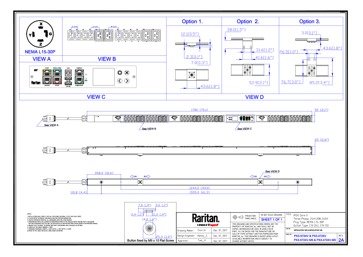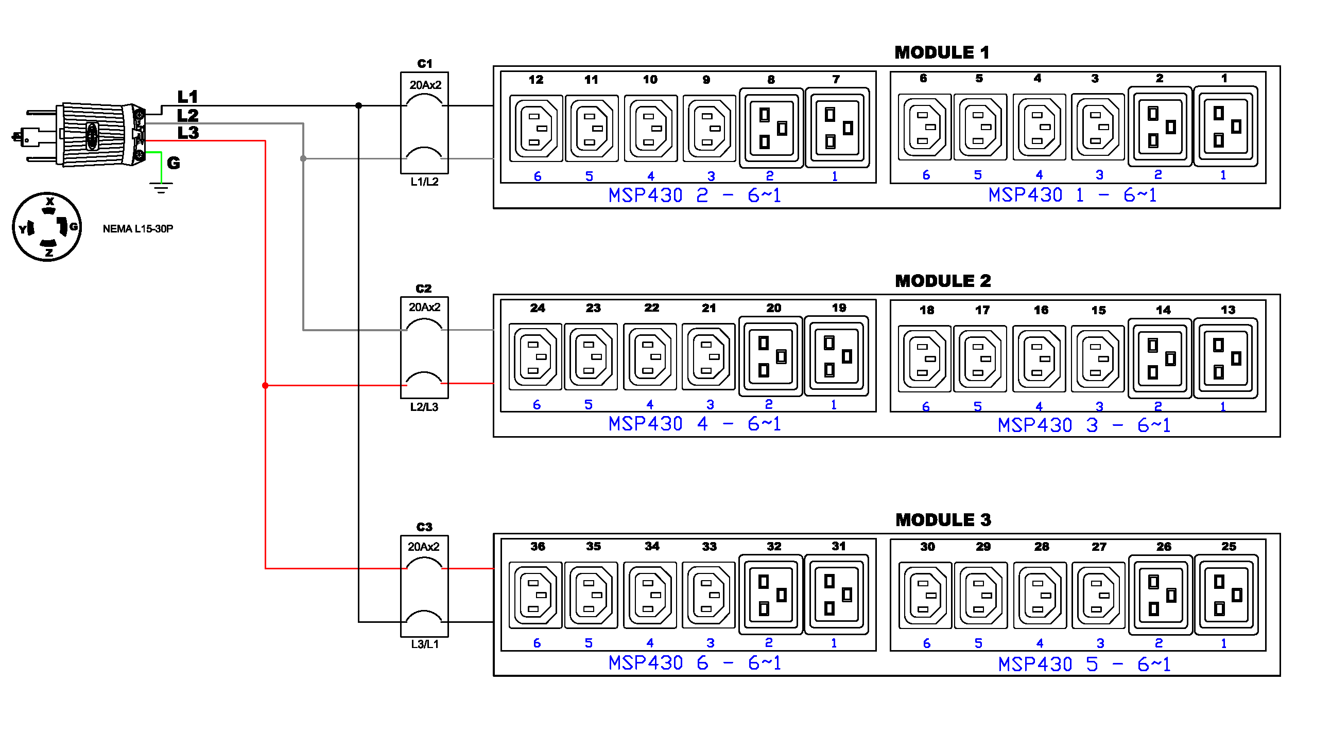 3PH, 208V AC, 30A (24A/PH rated); 36 outlets: 24x C13, 12x C19; plug: NEMA L15-30P (Delta Bottom-bottom feed), 8.6kVA; Outlet Metered/Switched, Zero U vertical PDU
