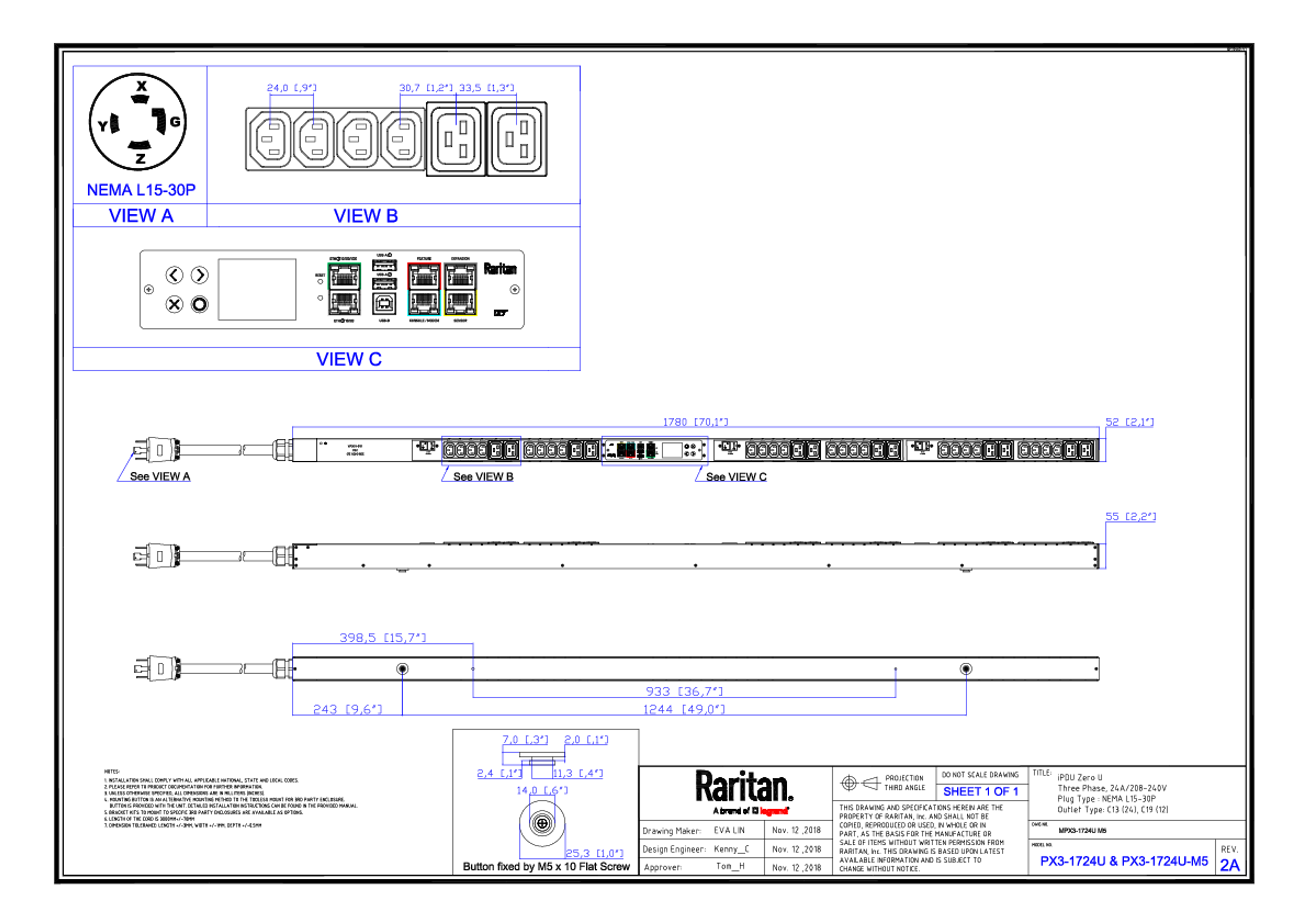 3PH, 208V AC, 30A (24A/PH rated); 36 outlets: 24x C13, 12x C19; plug: NEMA L15-30P (Delta Top-top feed), 8.6kVA; Unit Metered, Zero U vertical PDU
