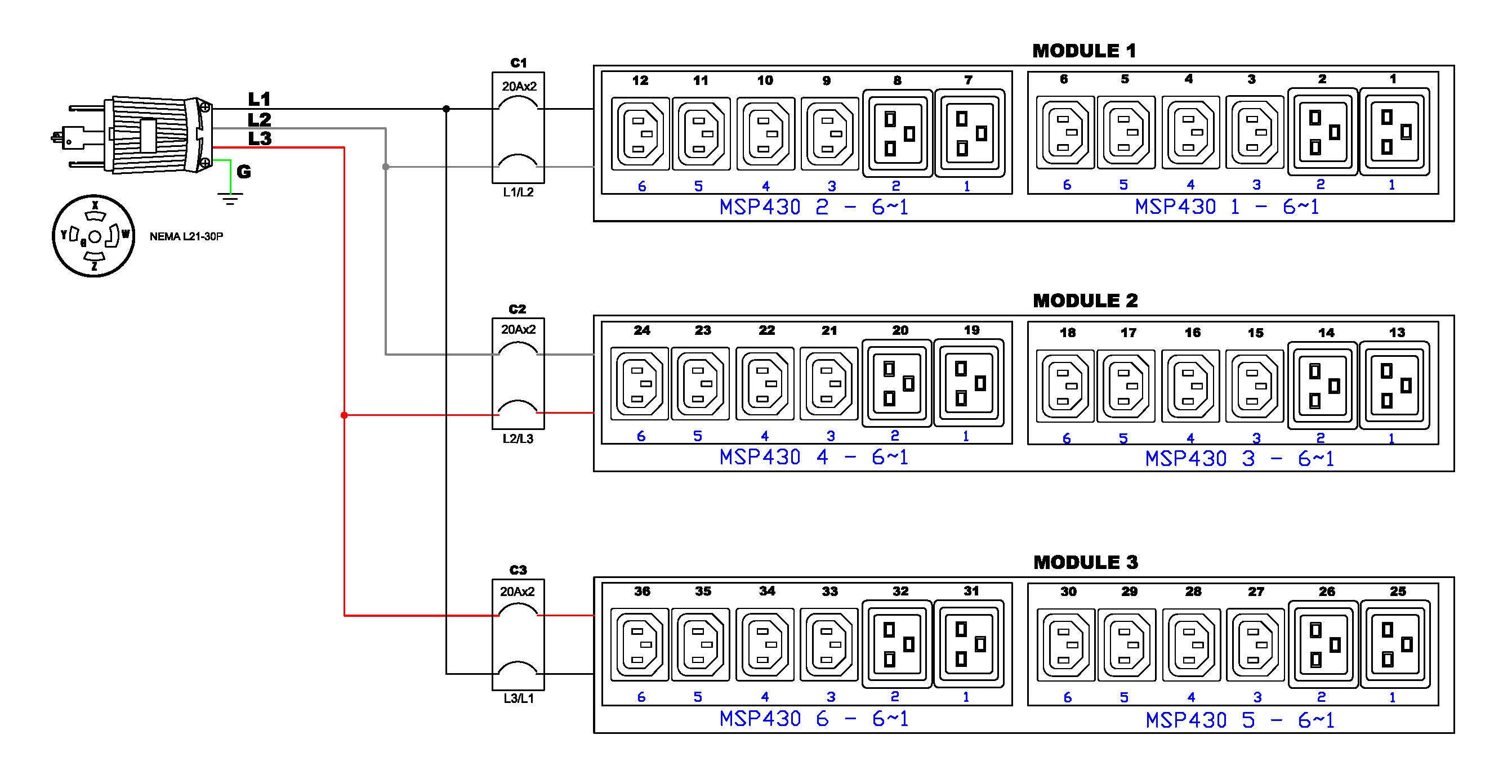 3PH, 208V AC, 30A (24A/PH rated); 36 outlets: 24x C13, 12x C19; plug: NEMA L21-30P (Wye Bottom-front feed), 8.6kVA; Outlet Metered, Zero U vertical PDU