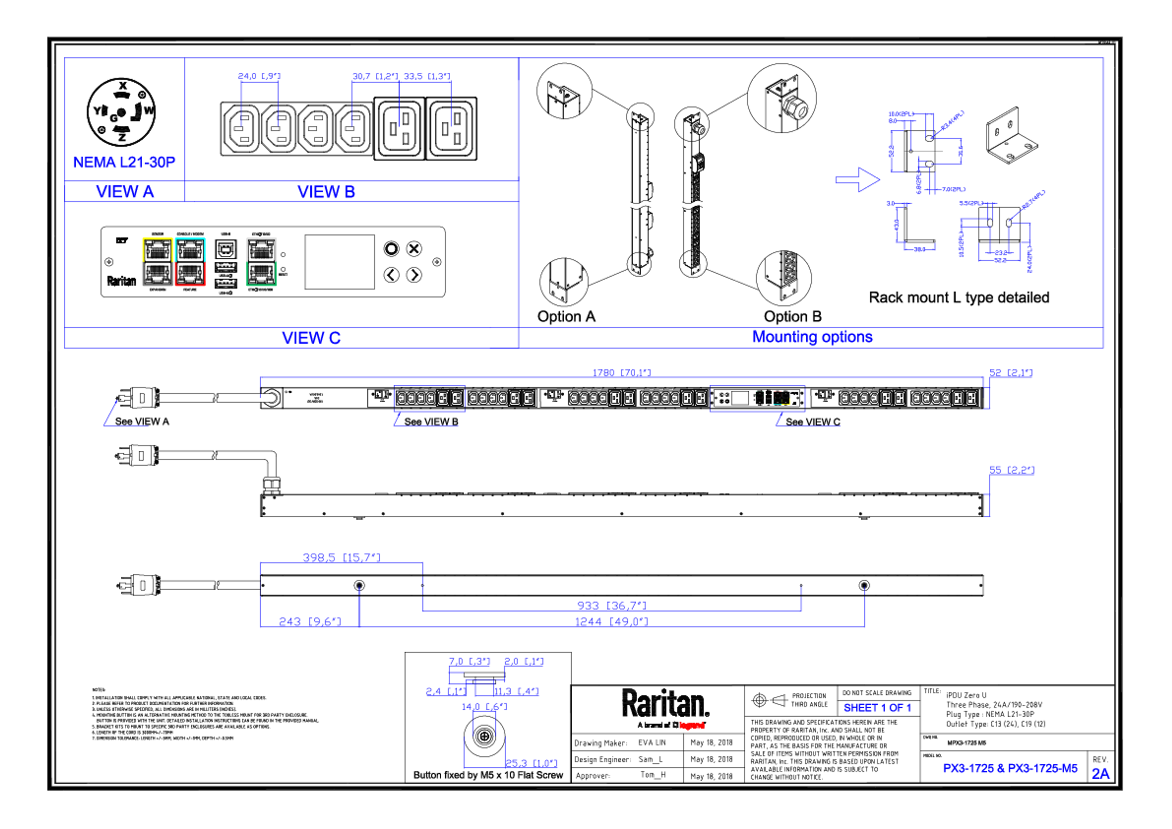 3PH, 208V AC, 30A (24A/PH rated); 36 outlets: 24x C13, 12x C19; plug: NEMA L21-30P (Wye Bottom-front feed), 8.6kVA; Unit Metered, Zero U vertical PDU